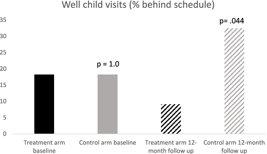 Logistic regression was used to model “behind schedule” for well-child visits. The final model contained only the treatment group as a predictor. The odds ratio for the treatment group predicting “behind schedule” was 0.26 (p = 0.044), indicating that those in the treatment group had lower odds of being behind schedule for well child visits than the control group.