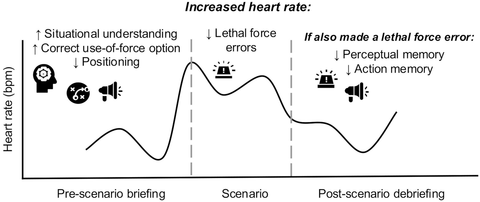 A substantial amount of applied research has examined perceptual, motor, and cognitive processing in stressful police contexts more broadly. The literature highlights deficits associated with stress, such as: fine, gross (i.e., arrest, self-defence skills), and visuo-motor behaviors (i.e., gaze, fixation, blinking); perception of time, distance, and positioning, and; critical decision-making related to UOF (for reviews, see Anderson et al., 2019; Di Nota and Huhta, 2019). Increased physiological arousal and accompanying performance decrements are observed during high-threat reality-based scenarios commonly used in operational field settings, as well as law enforcement training, assessment, and research (Anderson et al., 2002; Baldwin et al., 2019; Baldwin et al., 2022; Nieuwenhuys and Oudejans, 2011; Nieuwenhuys et al., 2012a, 2012b). Reality-based scenarios serve an important function by affording officers an opportunity to safely practice relevant skills in dynamic and representative environments (e.g., utilizing actors, simulated injuries and weapons, or varying levels of threat or complexity) including rare occurrences like mass casualty events or lethal force encounters (Baldwin et al., 2018; Jenkins et al., 2020; Körner and Staller, 2021).