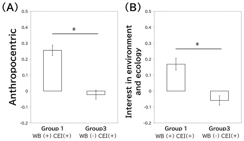Differences between Groups 1 and 3 in the anthropocentric and interest in the environment and ecology categories. Group 1 comprised those with high cultural estrangement and high wellbeing, while Group 3 comprised those with high cultural estrangement and low wellbeing. Asterisks indicate p < 0.05. (A) Shows the anthropocentric values, while (B) shows the interest in environment and ecology values. The bars indicate the mean, and the error bars indicate the standard errors. CEI indicates cultural estrangement and WB indicates wellbeing.