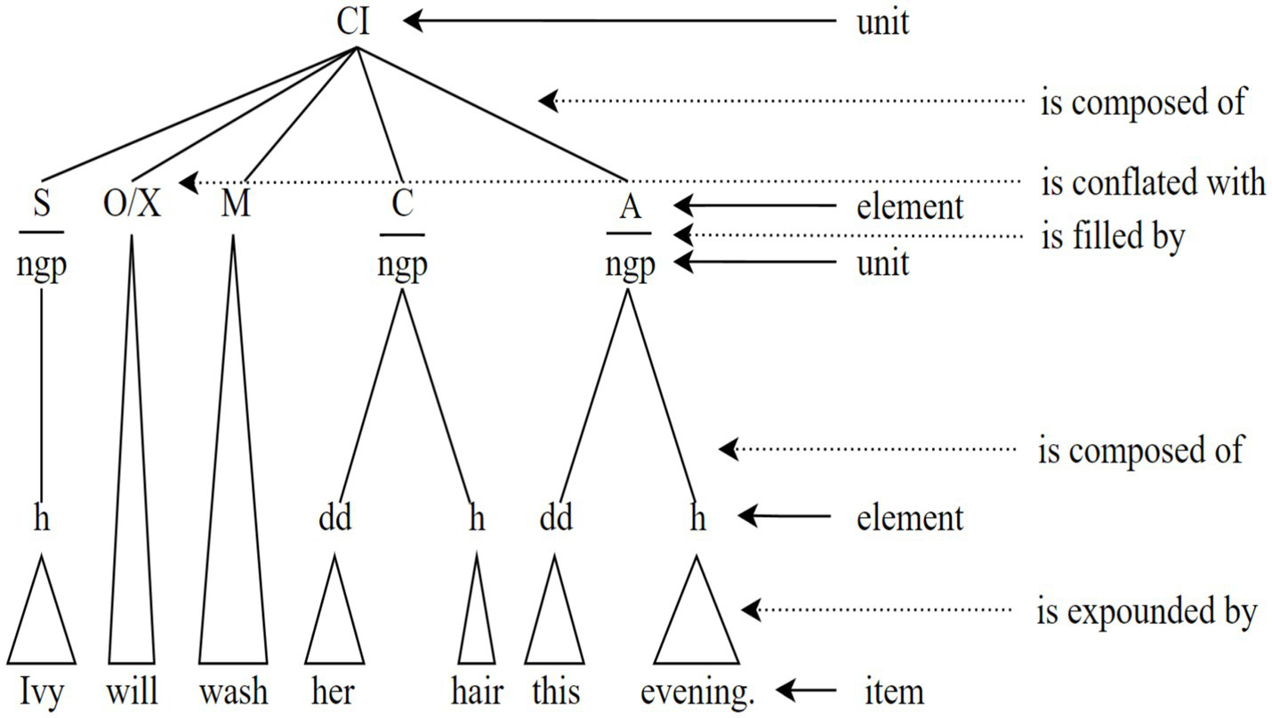 Based on these three principles, four functional syntactic categories and relations are posited (Fawcett, 2008, 2010). The former includes unit, element, place, and item, while the latter encompasses componence, filling, exponence, and conflation. The basic syntactic categories and relations in CG can be represented in Figure 2.