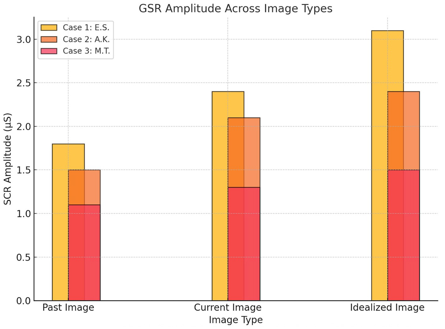 Skin Conductance Response (SCR) amplitudes across image types for each participant. Case 1 (E.S., active MD) showed the strongest autonomic reactivity, particularly to the idealized image. Case 2 (A.K., recovered MD) demonstrated moderate increases, while Case 3 (M.T., control) exhibited the lowest and most stable responses across all conditions (Figure 3).