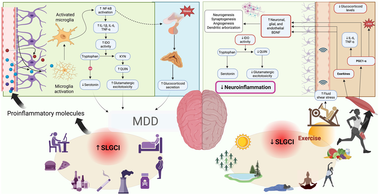 Figure 1. Conceptual framework illustrating how chronic inflammation contributes to Major Depressive Disorder (MDD), and how exercise and lifestyle factors may counteract it. On the left side, chronic low-grade inflammation (↑ SLGCI) is fueled by modern lifestyle factors such as poor diet, sedentary behavior, smoking, alcohol consumption, inadequate sleep, and psychosocial stress. This leads to increased systemic levels of proinflammatory molecules (e.g., IL-1β, IL-6, TNF-α), which can cross the blood–brain barrier and activate microglia. Activated microglia release additional cytokines and neurotoxic metabolites (e.g., quinolinic acid) via the kynurenine pathway, contributing to neuroinflammation, impaired serotonin signaling, glutamatergic excitotoxicity, reduced BDNF levels, and ultimately, the development of MDD or depressive symptoms. On the right side, regular exercise and healthy lifestyle habits—such as physical activity in natural environments, social interaction, adequate sunlight exposure, stress management, and a nutrient-rich diet—are associated with reduced systemic inflammation (↓ SLGCI). Exercise promotes anti-inflammatory effects through various pathways, including shear stress-induced production of exerkines (e.g., IL-6 with anti-inflammatory action, BDNF), improved mitochondrial function, and modulation of immune responses. These adaptations help decrease peripheral and central inflammation, enhance neuroplasticity, and alleviate depressive symptoms. BDNF, Brain-derived neurotrophic factor; IDO, indoleamine 2,3-dioxygenase; KYN, Kynurenine; MDD, Major Depressive Disorder. NF-κB, Nuclear Factor kappa-light-chain-enhancer of activated B cell; PGC1-α, Peroxisome proliferator-activated receptor gamma coactivator 1-alpha; QUIN, Quinolinic acid; SLGCI, Systemic low-grade chronic inflammation. Created with BioRender.com.