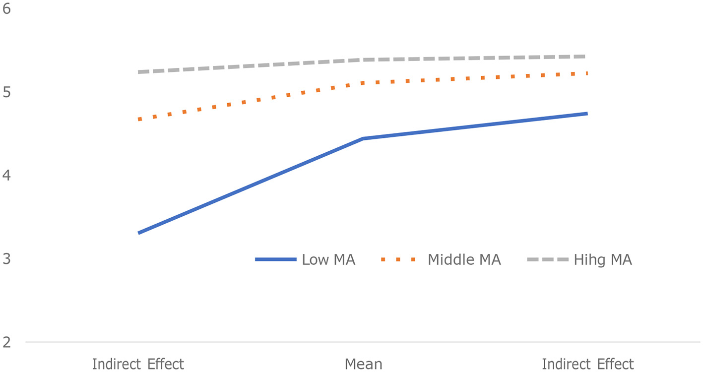 To assess the impact of perceived inequality on the association between SNS usage and luxury attitude across different mental accounting conditions, we conducted an indirect analysis as presented in Table 4. SNS usage positively influenced luxury attitude (B = 0.935, p = 0.001), and its effect on luxury attitude remained significantly negative (B = −0.451, p = 0.028) even after accounting for the control variables. Notably, the interaction term between perceived inequality and mental accounting reached statistical significance (B = 0.159, p = 0.039).
