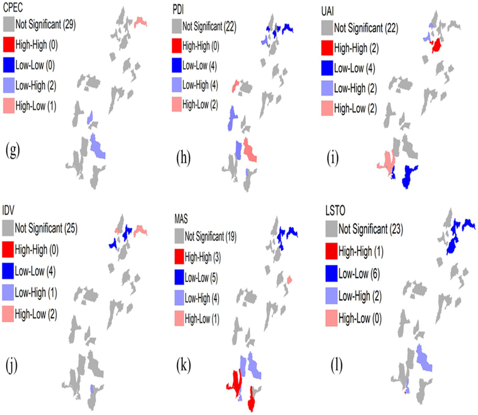 As shown in Table 1, descriptive statistics of the demographic data were analyzed using RStudio. The sample comprised 907 males (65.39%) and 480 females (34.61%). The age groups were distributed as follows: 88 aged 18, 324 aged 19–28, 602 aged 29–40, 278 aged 41–50, and 95 aged 51 years and above. In terms of education, 783 respondents held a bachelor’s degree or below, 400 held a master’s degree, and 204 held a PhD. Professionally, 259 respondents were students, 175 were government employees, 221 were private sector employees, 213 were self-employed or entrepreneurs, 240 worked in the tourism sector, and 279 were engaged in other professions. These demographics help contextualize how different social groups perceive cultural tourism development across CPEC and non-CPEC regions. Common Method Bias (CMB) was applied in RStudio using Harman’s single-factor test to assess CMB in the datasets. Then the PLS-SEM (Partial Least Squares Structural Equation Modeling) method was used for hypothesis testing and analyzing the relationships among Hofstede’s cultural dimensions (PDI, UAI, IDV, MAS, and L/STO). The model was tested using Smart-PLS version 4.1, and the reliability and validity of the constructs were confirmed through composite reliability, AVE, and outer loading VIF. Similarly, spatial data analysis was conducted to explore the geographic clustering of cultural tourism’s impacts. The techniques included Global Moran’s I and Local Indicators of Spatial Association (LISA). Additionally, we applied the Spatial Durbin Model (SDM) to assess the spatial spillover effects (SSE) of cultural and infrastructural variables between the CPEC and non-CPEC regions.