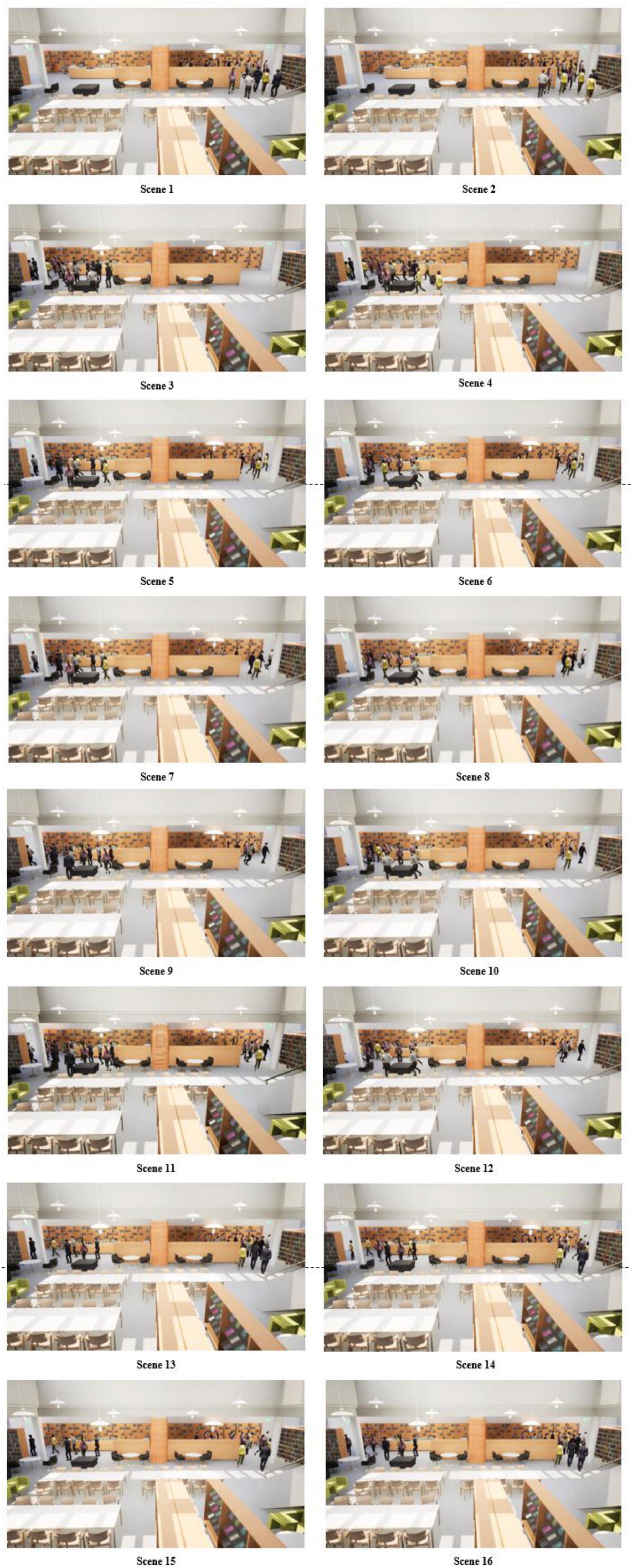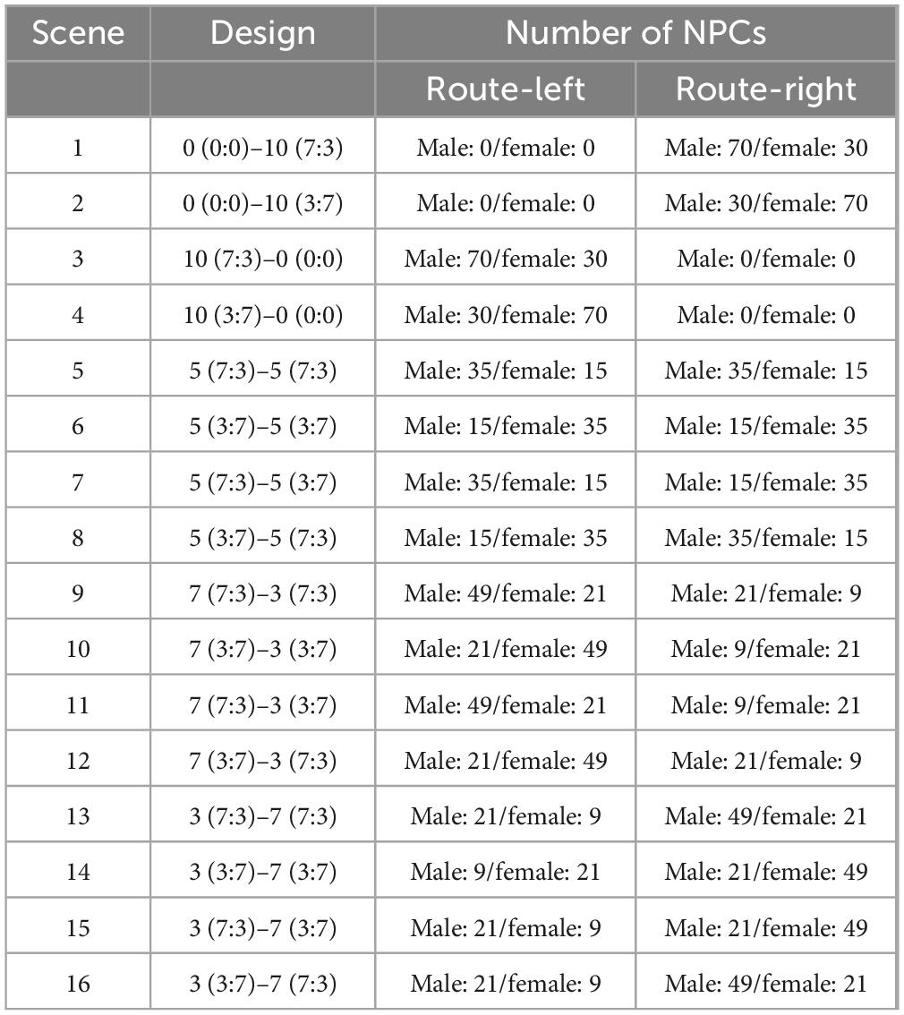 According to the design of the combination of experimental variables, there are 16 different experimental scenarios, Table 1 shows the specific combination of the 16 scenarios, and Figure 1 show the modeling scenarios of the 16 scenarios in VR. A total of 162 subjects participated in the route selection of the 16 scenarios in a randomized order, and each scenario took roughly 3 min. The movement speeds of the NPCs in the experimental scenarios ranged from 2.3 m/s to 2.5 m/s.