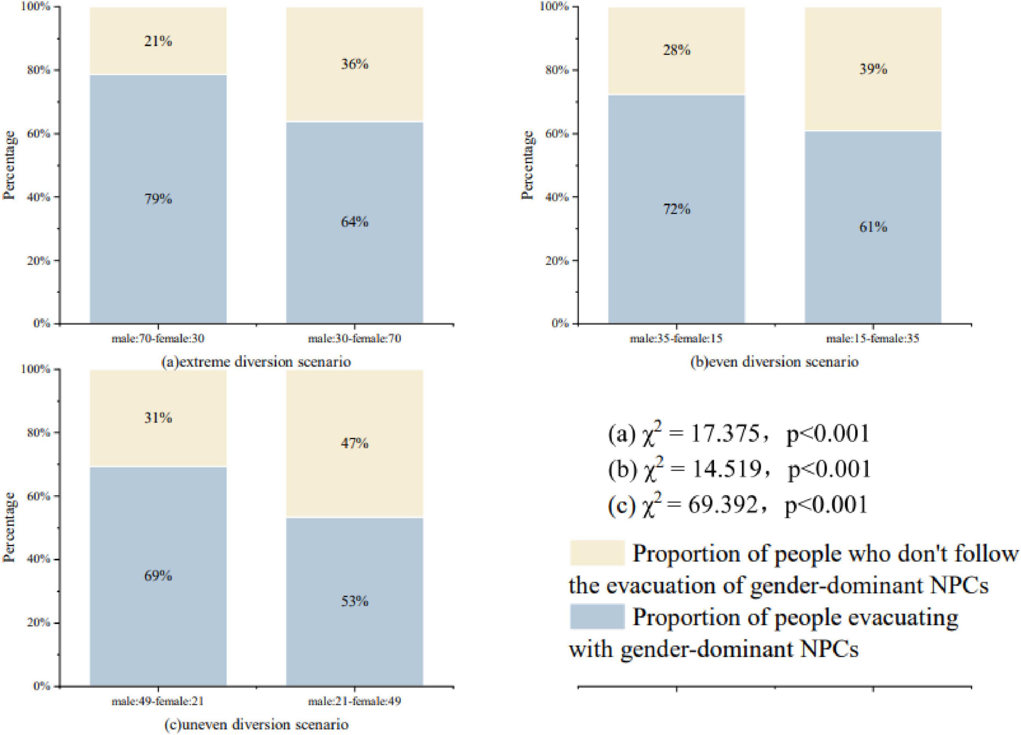 Figure 3 shows the proportion of evacuation routes chosen by subjects with different gender distribution ratios of NPCs. (a) In the extreme diversion scenario, all NPCs choose a certain evacuation route for evacuation, but different gender ratios are set. male: 70-female: 30 indicates that when all NPCs choose to evacuate to the left or to the right, there are 70 male NPCs, and 30 female NPCs; where male: 70-female: 30 combines the route choice data for Scenario 1 and Scenario 3, and male: 30-female: 70 combines the route choice data for Scenario 2 and Scenario 4. When males are in the majority, 79% (255) subjects choose to follow the evacuation; when females are in the majority, 64% (207) subjects choose to follow the evacuation. When males were in the majority, 79% (255) of the subjects chose to follow the evacuation; when females were in the majority, 64% (207) of the subjects chose to follow. After a chi-square test (χ2 = 17.375, p < 0.001), it illustrates that pedestrians tend to follow the evacuation of subjects with a greater proportion of males in extreme diversion scenarios (79% > 64%).