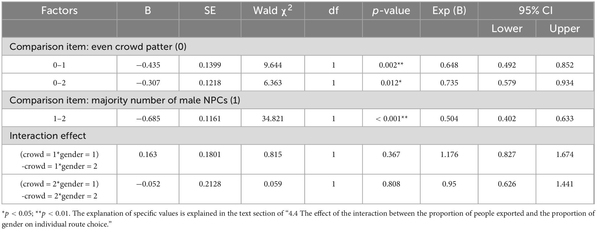 The generalized linear model can be used to analyze the dichotomous dependent variable, which was used to analyze the existence of interaction of independent variables. The omnibus test of the model has P < 0.001, so the original hypothesis is rejected and the model as a whole is considered to be significant, i.e., the independent variables have a significant explanatory power for the dependent variable. To investigate whether the uneven distribution of crowd size produces a herding effect on pedestrians, the crowd distribution patterns were coded as 0 (even crowd distribution), 1 (extreme crowd distribution), and 2 (uneven crowd distribution). The contrast terms were 0, i.e., 1 vs. 0 and 2 vs. 0. For the gender distribution ratios coded as 1 (majority number of male NPCs) and 2 (majority number of female NPCs), this was coded to explore whether pedestrians were more inclined to follow the male/female group for evacuation.