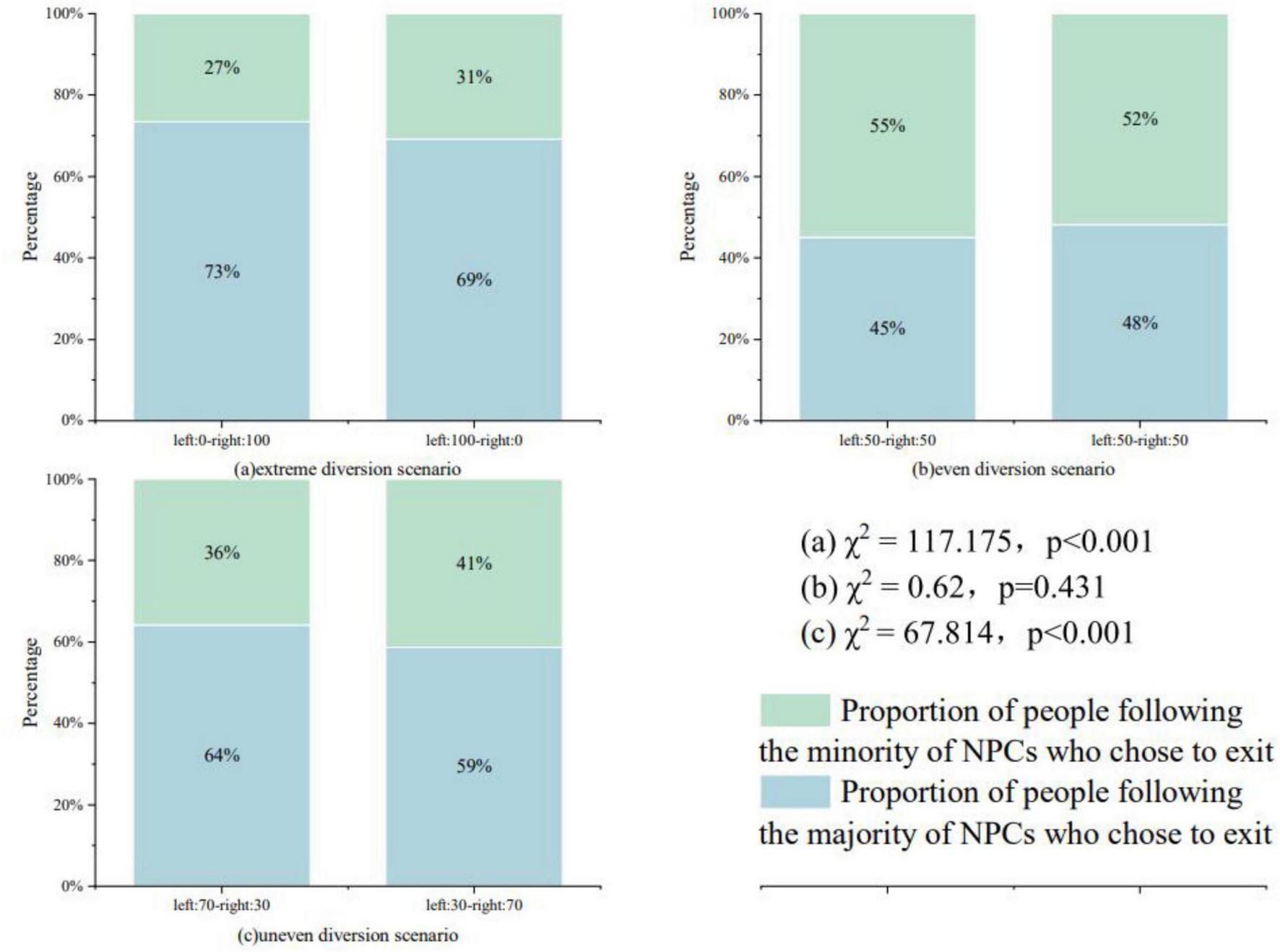Figure 2 demonstrates the proportion of evacuation routes chosen by the subjects under different distribution ratios of the number of NPCs. (a) The setup scenarios with extreme distribution ratios of the crowd include Scenario 1-Scenario 4. left: 0-right: 100 indicates the scenario in which all 100 NPCs chose the road to the right for evacuation and no NPCs chose the road to the left for evacuation. Where left: 0-right: 100 merges the route choice data for scenarios 1–2 and left: 100-right: 0 merges the subject data for scenarios 3–4. As can be seen in the figure, when all NPCs chose the road to the right, 73% (238) of the subjects chose to follow the NPCs; when all NPCs chose the road to the left, 69% (224) of the subjects chose to follow the NPCs, the chi-square results indicate that the extreme diversion ratio significantly affects the pedestrian’s route choice (χ2 = 117.175, p < 0.001),pedestrians chose to follow the majority of the people for evacuation (73% > 27%, 69% > 31%).