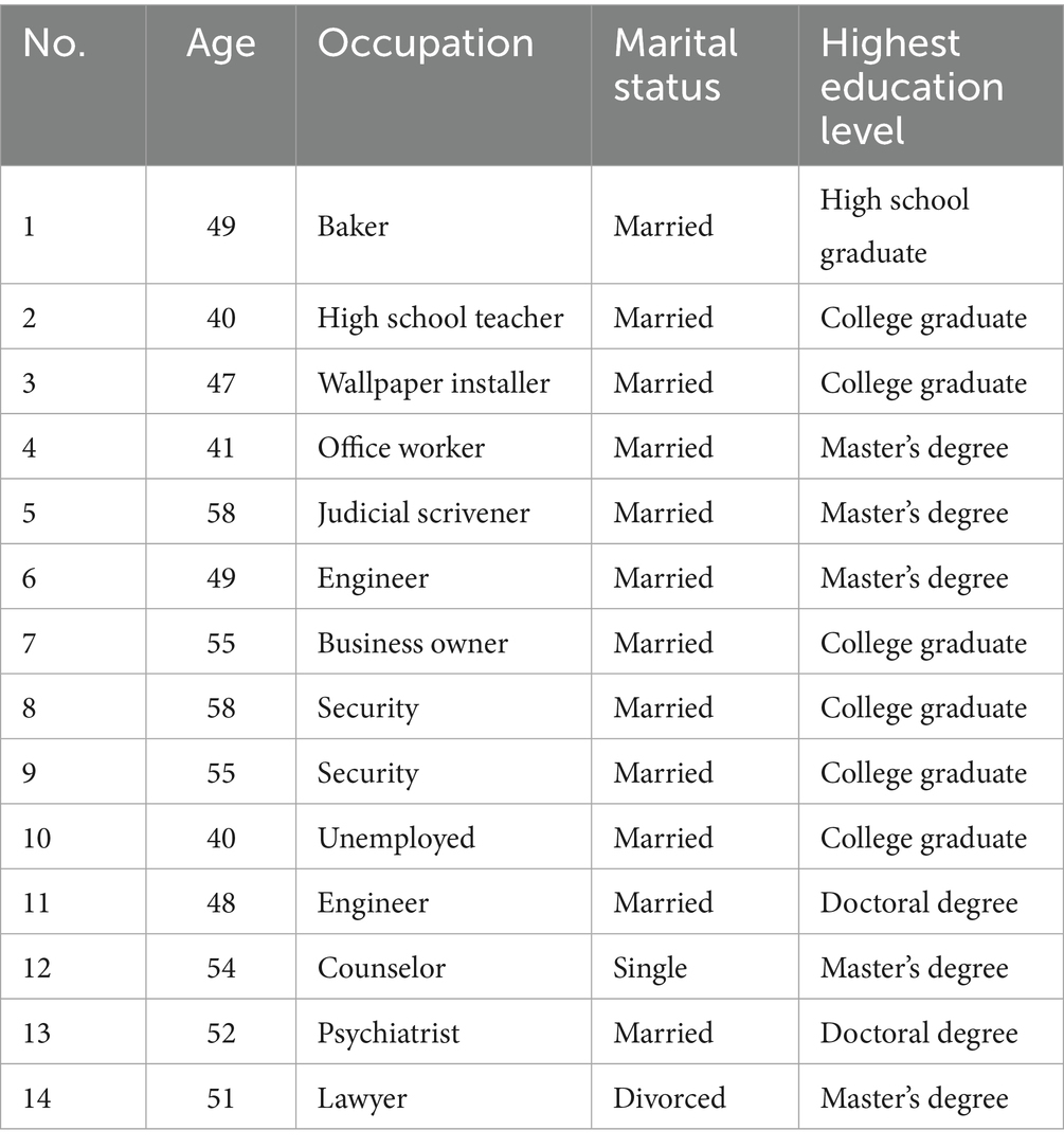 A purposeful sampling strategy was employed to recruit participants. Fourteen middle-aged men (aged 40–59 years) participated in this study. The average age of participants was 51.32 years (SD = 7.31). All participants reported experiencing psychological distress associated with their childhood relationships with their patriarchal and strict fathers. Psychological distress was assessed using a prescreening interview in which participants were asked to describe emotionally difficult memories involving their fathers. Individuals were included if they reported ongoing emotional difficulties related to these relationships, such as persistent resentment, sadness, helplessness, or regret. Commonly expressed feelings toward fathers include resentment, helplessness, and regret. While this focus may limit the generalizability of the findings, it reflects a culturally significant dynamic in South Korea, where rigid father-son relationships and traditional masculinity norms continue to shape men’s emotional development (Sung and Joeng, 2019). Exploring how these men engaged in emotion-focused techniques in a VR environment offers important insights into therapeutic approaches tailored to populations facing cultural barriers to emotional expression. Table 1 presents the detailed participant characteristics.