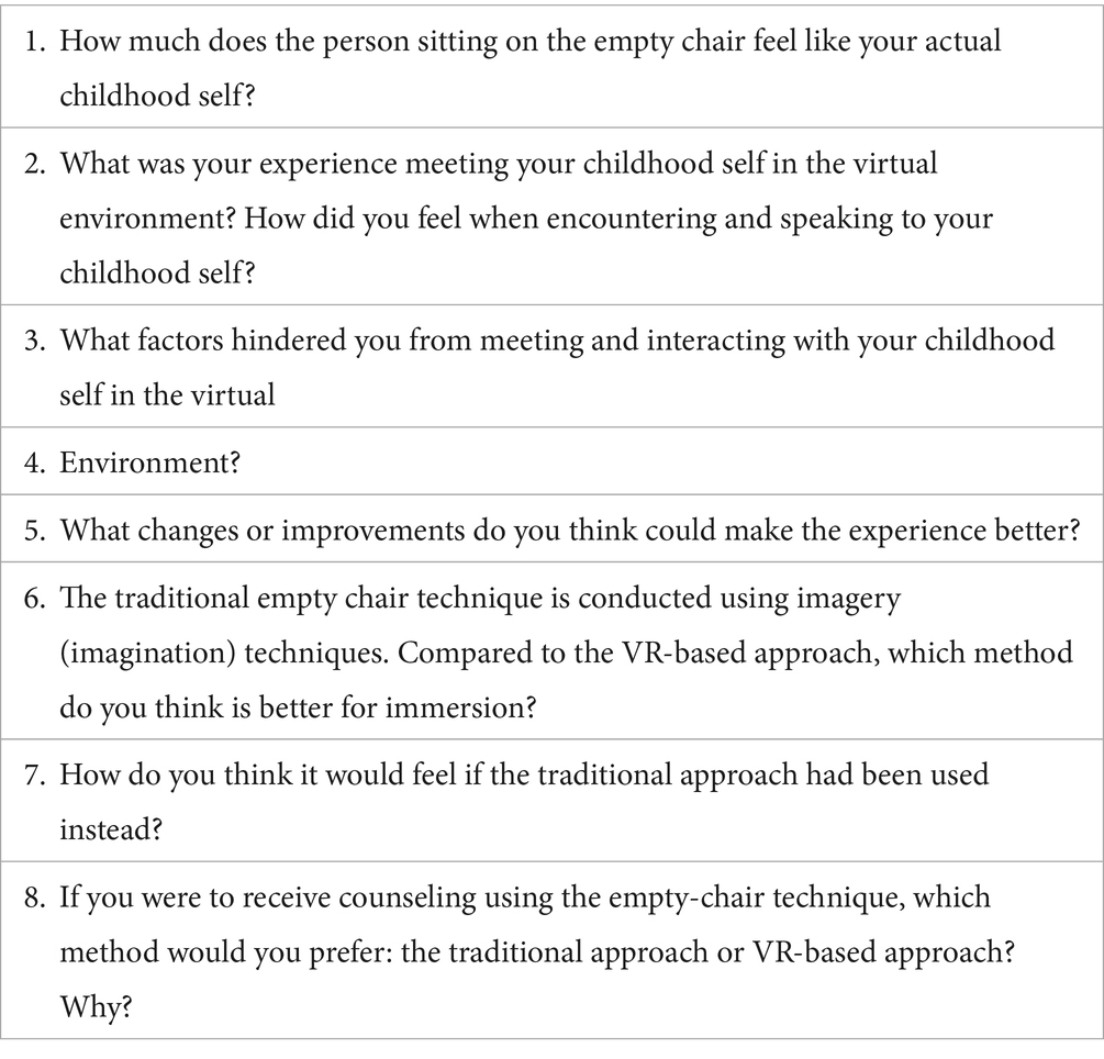 To assess participants’ experiences within the virtual environment, the I-group Presence Questionnaire (IPQ; Schubert, 2003) was administered. This instrument evaluates three key dimensions: presence (the subjective sense of “being there”), immersion (the level of engagement), and realism (the perceived authenticity of the environment). The IPQ consists of 11 items rated on a 7-point Likert scale (1 = very unlikely, 7 = very likely). In the present study, internal consistency was acceptable, with Cronbach’s α values of 0.81 for presence, 0.75 for immersion, and 0.80 for realism. Participants’ subjective experiences were further examined through in-depth interviews guided by a semi-structured protocol comprising seven open-ended questions (see Table 2). The protocol included prompts specifically designed to explore psychological distress associated with participants’ childhood experiences, particularly those involving their fathers. All interviews were conducted in Korean, audio recorded with participants’ consent, and transcribed verbatim for analysis.
