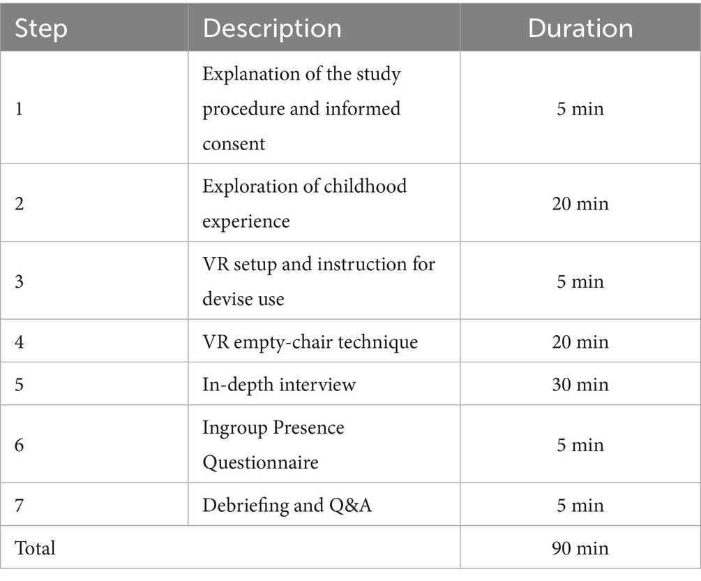 Each session lasted approximately 90 min and consisted of four sequential stages: rapport building and pre-intervention discussion, VREC intervention, questionnaire administration, and in-depth interviews (see Table 3). In the pre-intervention phase, participants engaged in a brief conversation with the researcher to build rapport and then guided to reflect on their childhood experiences, particularly their relationships with their fathers. Participants were asked to recall emotionally significant memories and consider messages they would like to communicate with their younger selves. Common themes included expressions of comfort, empathy, and reassurance, such as “You are not alone” or “You deserve love and respect.”