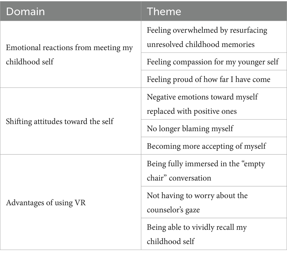 The positive experiences perceived by the participants were categorized into three domains: emotional reactions from meeting their childhood self, shifting attitudes toward the self, and the advantages of using VR. Nine themes were identified across the domains. The results are summarized in Table 4.