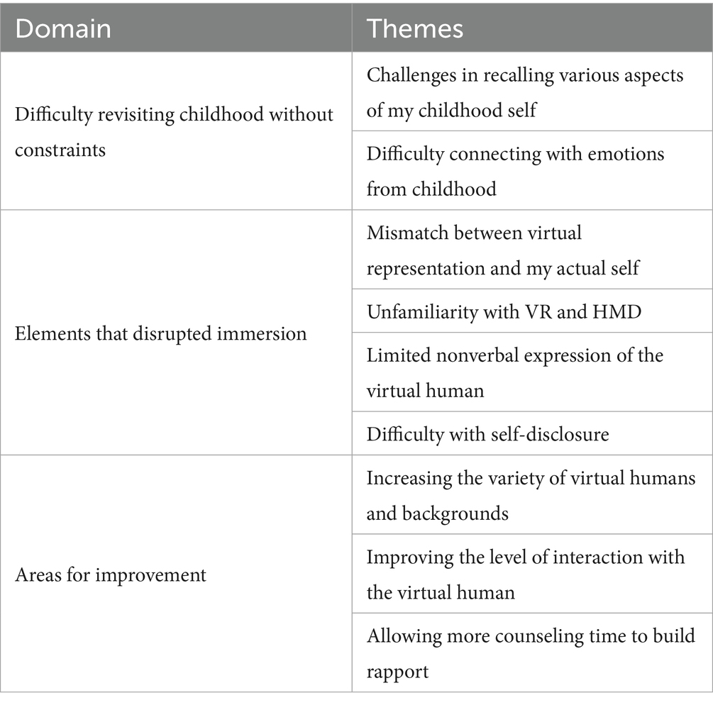 The second domain, “elements that disrupted immersion,” addressed the factors that hindered participants’ immersion during the VREC technique. This domain included four themes. The first theme, “mismatch between virtual representation and my actual self,” referred to instances in which the appearance of the virtual representation differed from the participants’ actual childhood memories, making it difficult for them to fully immerse themselves in the process. An example of this theme is as follows: