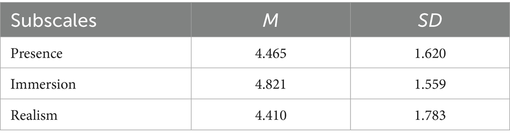 As shown in Table 6, the IPQ results indicate that the mean scores for presence, immersion, and realism are approximately 4 on a 7-point scale.
