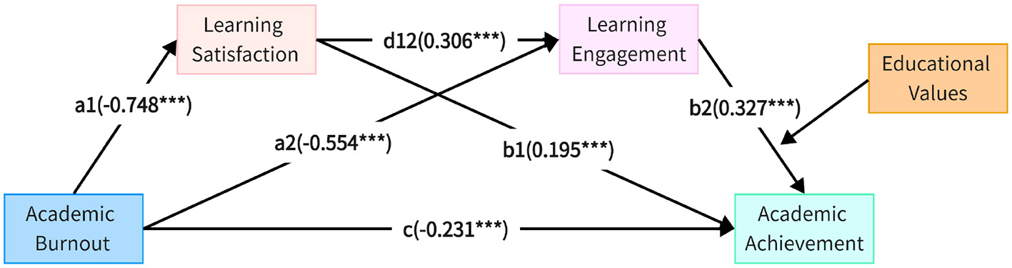 Academic burnout had a significant negative effect on academic achievement. Both learning satisfaction and learning engagement had significant positive effects on academic achievement and jointly played a chain mediation role between academic burnout and academic achievement. Educational values significantly moderated the effect of learning engagement on academic achievement, as well as the entire chain mediation pathway.