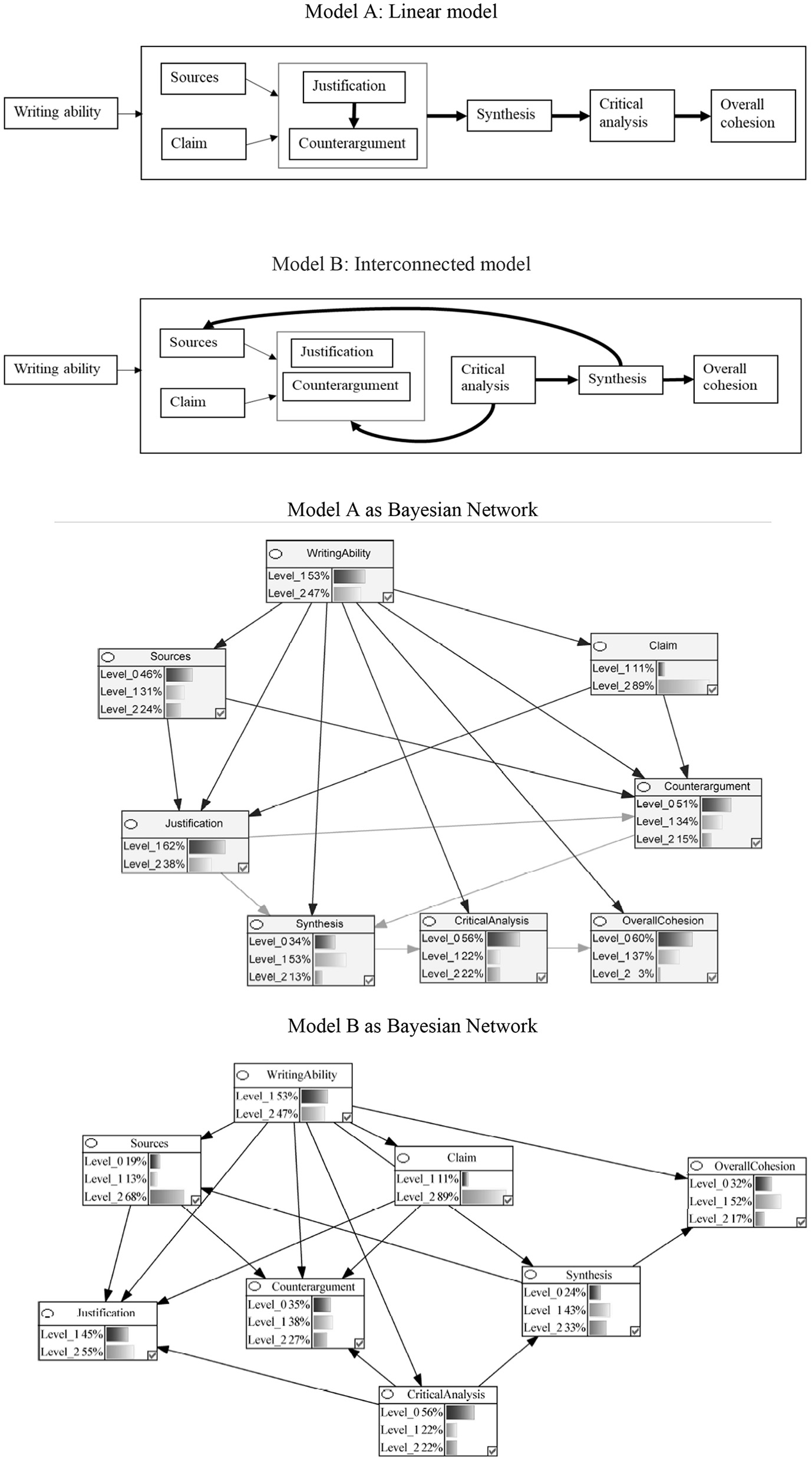 Theoretical Models and Corresponding Bayesian Networks of the Componential Process of MSU Argumentative Essay Writing in the Production Stage. The percentages represent the probability of the undergraduates performing at a specific level in this study. Arrows represent causal relations between variables. Level_0 = Below Average; Level_1 = Average; Level_2 = Above Average.