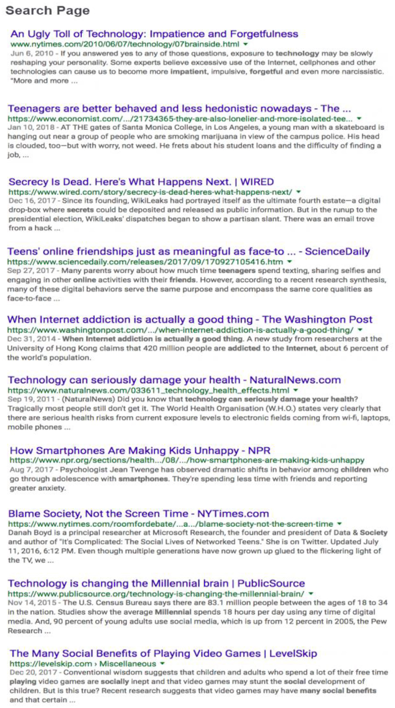 The 10-document digital library was linked to a menu that resembled a Google search page with the title, publisher, date of publication, URL, and a blurb for each document (see Figure 3). The documents linked to the menu were screenshots of original websites from the Internet with minimal modifications (e.g., removing the comment section). The documents varied by type (e.g., blog post, newspaper article, popular magazine), source credibility, content trustworthiness, and perspectives on the topic (see Table 1). Text length varied from 340 to 1,787 words. To verify the features of the documents in the digital library, the first and fourth authors independently coded each for the level of source credibility (high or low), overall content trustworthiness (high or low), and topic stance (agree, disagree, or neutral). The interrater agreement was 96.7%. Consensus was reached on all these dimensions of text features through discussion.