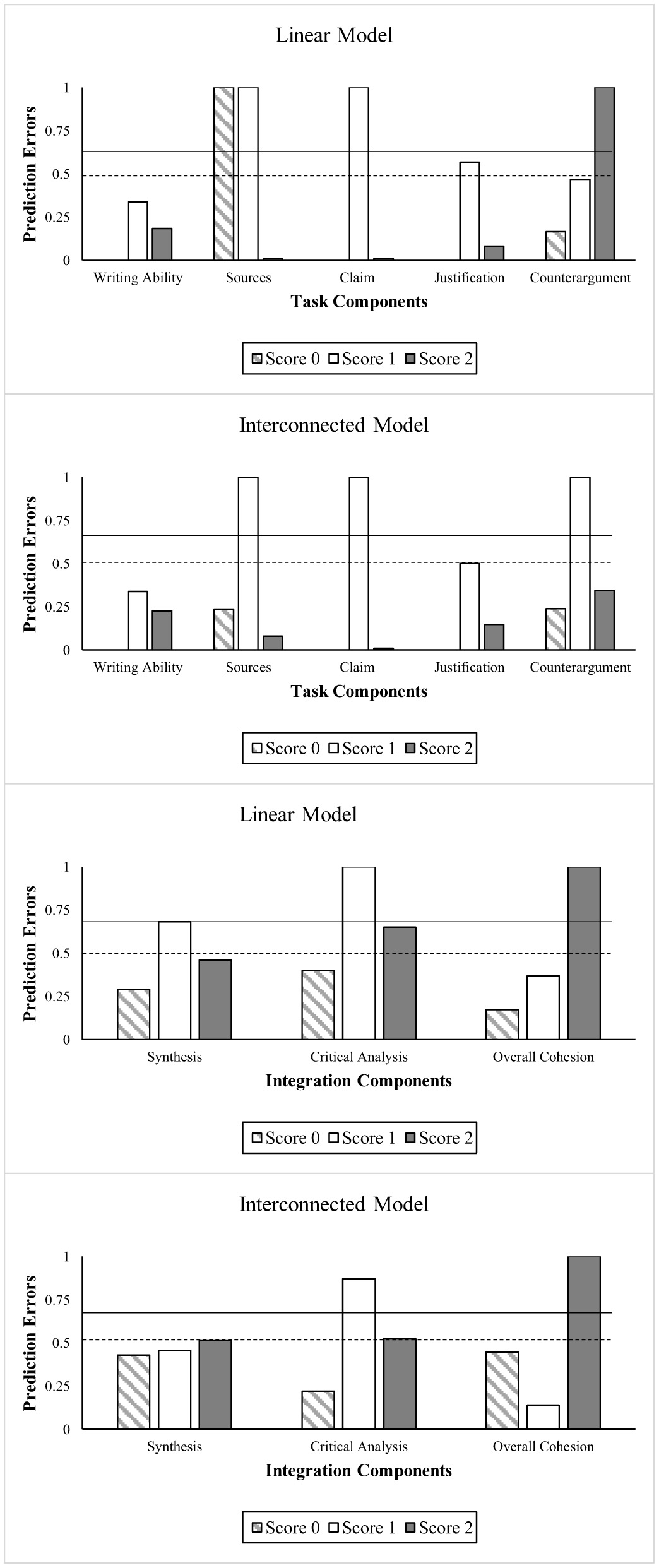 For argumentative essay writing, we hypothesized that writing ability would have a substantial influence on all subsequent task and integration components. We expected that formulating a clear claim early in the writing process would positively impact justifications, counterarguments, and integration components. Furthermore, given that this is a multiple source use task, we predicted that effective source use would be a key component for producing a quality essay, influencing both task components (justifications and counterarguments) and integration components.
