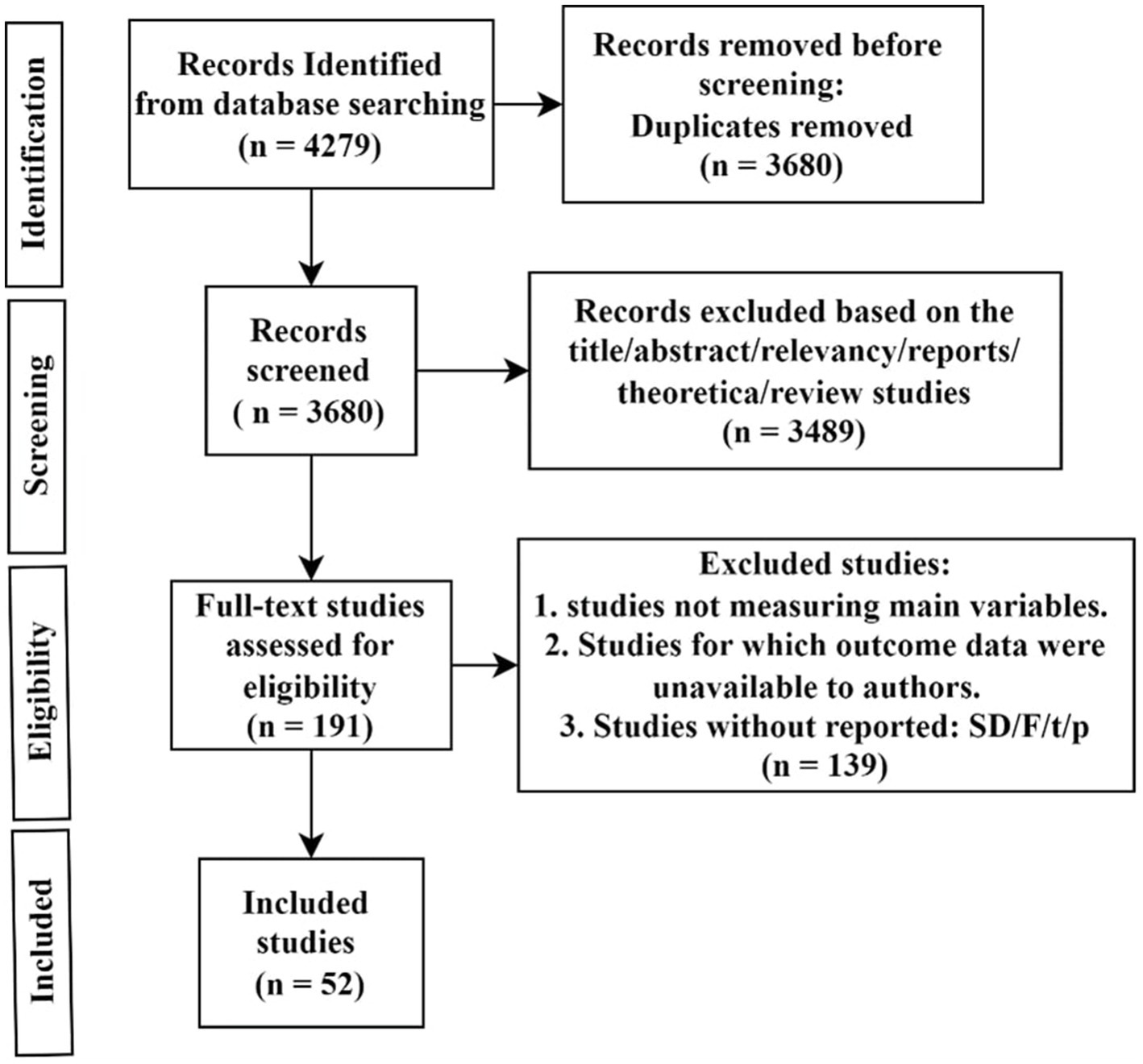 Flow chart for selection of included studies. The PRISMA-style flowchart depicts the study selection process, from initial database searches (n = 4,279) to final inclusion (n = 52), with exclusion criteria clearly specified.