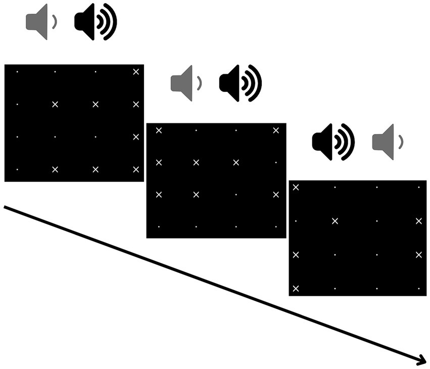 Schematic representation of the experimental paradigm for the TAP subtest in the dual-task condition. Each square represents a possible configuration of the matrix for the visual task. In the upper part gray and black volume icons represent single stimuli for the auditory task (low and high tones respectively). Specifically, the central screenshot contains the target configuration for the visual task [on the left side, four “x” forming a square, while the fifth volume icon (from the left) is a target for the auditory task (two consecutive high tones)].