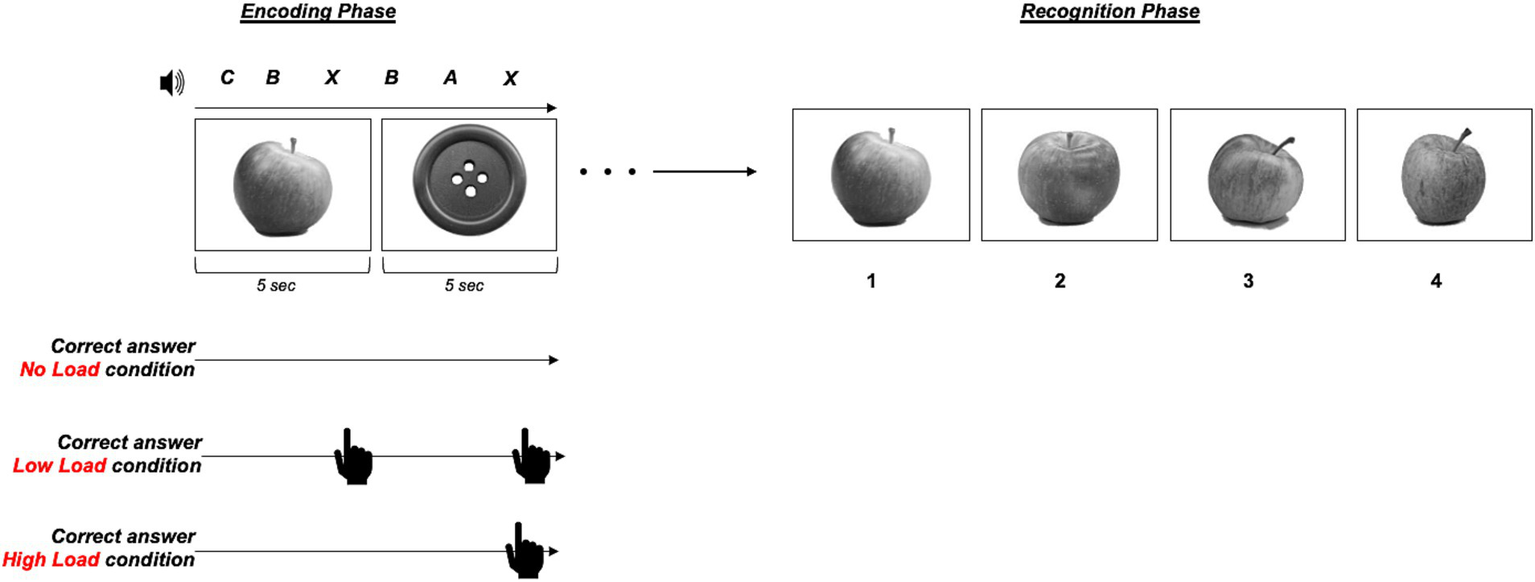 Schematic representation of the experimental paradigm for the MEMO subtest, combining a primary visual memory task and a secondary auditory sustained attention task (i.e., ACPT). The encoding phase (left) differed across conditions. In the No Load condition participants encoded the images without performing the ACPT (no response required during encoding); in the Low Load they were required to encode the images while responding to the ACPT whenever the letter “X” was presented; in the High Load condition they were required encode the images, while responding to the ACPT but only when the letter “X” was preceded immediately by the letter “A. After the encoding of the whole set of images responses were collected for each condition by using a forced-choice procedure among similar alternatives (Recognition phase, on the right).
