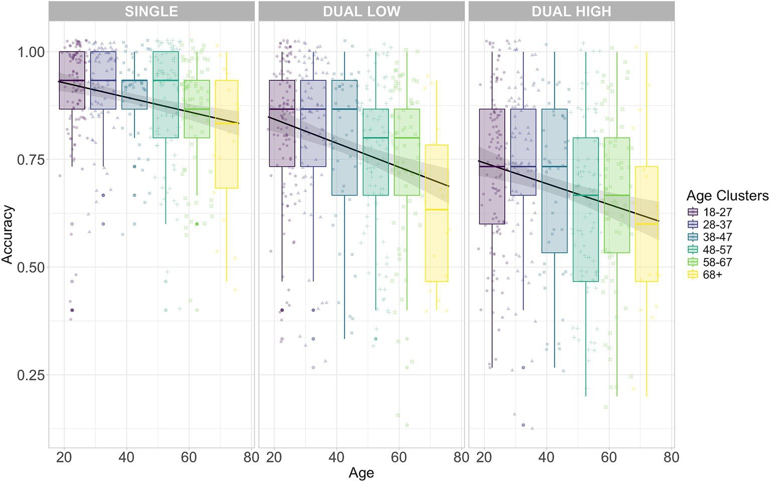 MEMO Accuracy in the primary task (image recognition) is shown as a function of Age across the three Cognitive Load conditions. Each age cluster is represented by a distinct color (legend on the right). Each point represents individual accuracy. Each black line refers to the task-specific linear regression on Accuracy with Age as dependent variable. Shaded areas represent the corresponding standard errors.