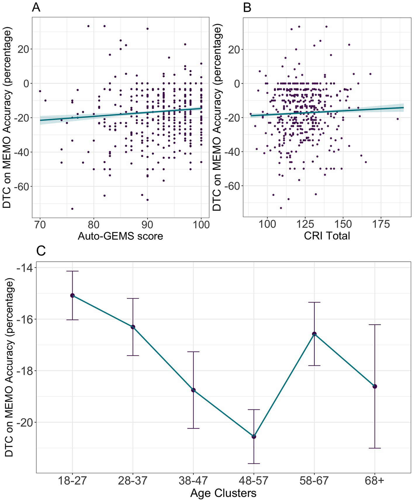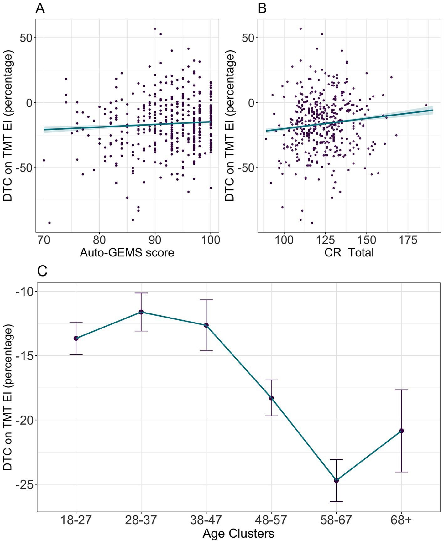 The significance of fixed effects and interactions was evaluated with the “Anova” function from the “car” package (Fox and Weisberg, 2019). We ran Type III ANOVA (Wald Chi-Square) for mixed models with interactions and Type II ANOVA (F-test) for linear regression with no interaction terms. Pairwise comparisons were conducted using the “emmeans” function from the “emmeans” package (Lenth, 2024) to explore differences across age clusters and conditions. The False Discovery Rate (FDR) adjustment method was used to control for Type I error inflation. For each model, we reported the Wald chi-square or F-test statistics for the predictors and interactions, as appropriate. When relevant, we provided the corresponding model fit statistics, including the regression coefficients (β) and p-values. In cases where multiple comparisons were described, we reported the estimated means, standard errors (SE), degrees of freedom (df), t-values, and p-values for each comparison. We performed partial correlation analyses using the residuals from linear models that predicted DTCs across different tasks. These models controlled for the effects of Age, Cognitive Efficiency (Auto-GEMS) and CR. By examining the correlations among residuals, we aimed to assess whether DTCs from different tasks exhibit shared variance beyond the effect of age, cognitive efficiency and CR indices. To further investigate the role of these variables in modulating the DTC, a mediation analysis was conducted for each DTC assuming Auto-GEMS or CR scores as mediating variables in the relationship between Age (coded as continuous variable ranging from 18 to 76 years old in this case) and DTCs. The analysis was implemented with two linear regression models: one predicting the mediator from age and the other predicting the DTC outcome from both age and the mediator. Mediation effects were tested using the “mediate” function from the “mediation” package (Tingley et al., 2014), with bootstrapping to estimate confidence intervals for indirect effects. The mediation analysis is reported in Supplementary materials.