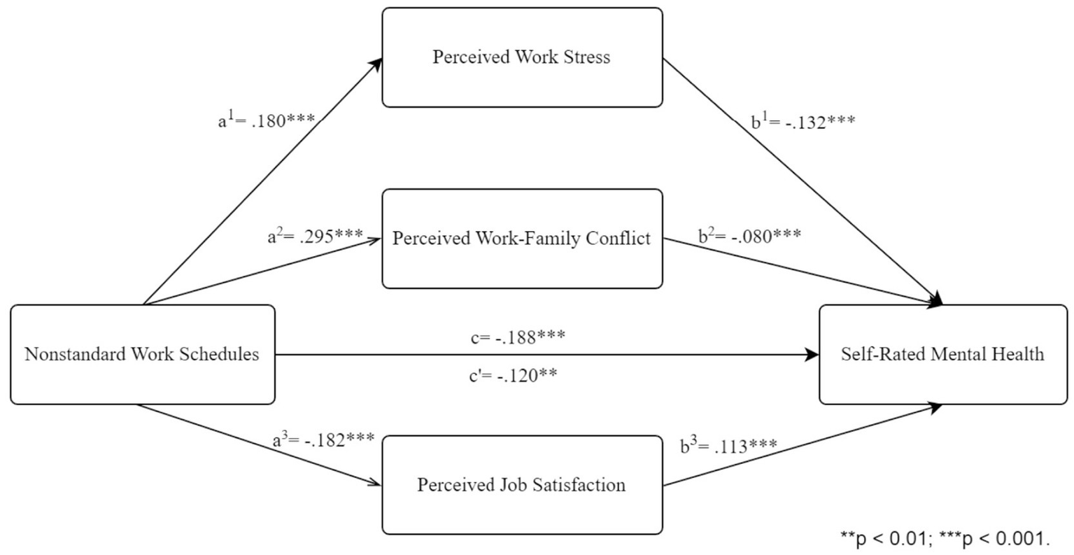 The aim of our study was to extend the line of the work schedule—mental health ideation scholarship by considering the role of psychosocial pathways underlying this association in a nationally representative sample in China. Specifically, using data from the latest 2021 wave of Chinese General Social Survey (CGSS), we examine the mediating effects of perceived work stress, work–family conflict and job satisfaction on the relation between nonstandard work schedules and employees’ self-rated mental health.