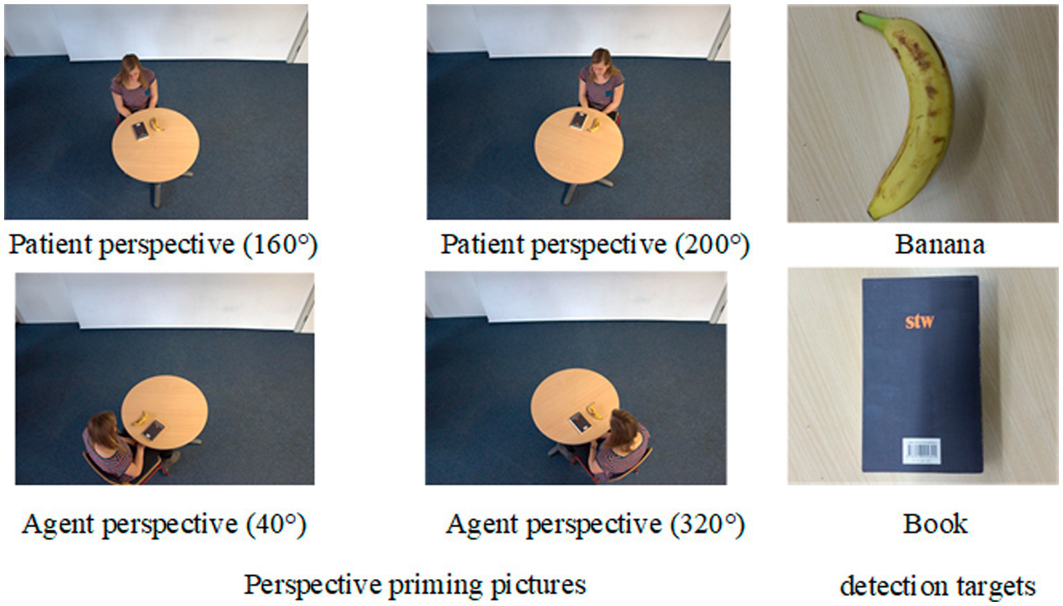There are four types of character rotation angles: 40°, 160°, 200°, and 320° clockwise. Each angle includes two images, one featuring a male character and the other a female character, with books and bananas placed in their left and right hands. A book and a banana image were used as detection targets. The images with 40° and 320° rotations served as agent perspective priming images, where the participant’s left- and right-hand directions aligned with those of the character in the image. In contrast, the images with 160° and 200° rotations served as the patient perspective initiation images, where the participant’s left- and right-hand directions were mirror-image opposites of the characters.