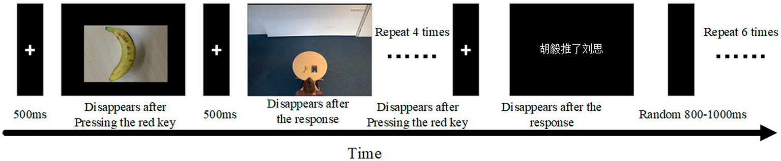 The two types of perspective priming and two types of the sentence constituted four experimental conditions, with 5 cycles per condition and 2 valid trials per cycle, for a total of 10 trials per condition. Each participant needed 25–30 min to complete the experiment.