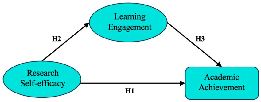 Research has consistently demonstrated the significant role of research self-efficacy, learning engagement, and achievement in an academic setting. Learning engagement has been found to significantly mediate the relationship between psychological characteristics and academic achievement across diverse student populations (Wang and Yan, 2019). Furthermore, both student engagement have been identified as a key mediator in the influence of teacher support on students’ academic performance (Huang and Wang, 2023). Specifically, engagement has been shown to mediate the direct influence of student motivation on academic outcomes. Building on these findings, we hypothesize the following: