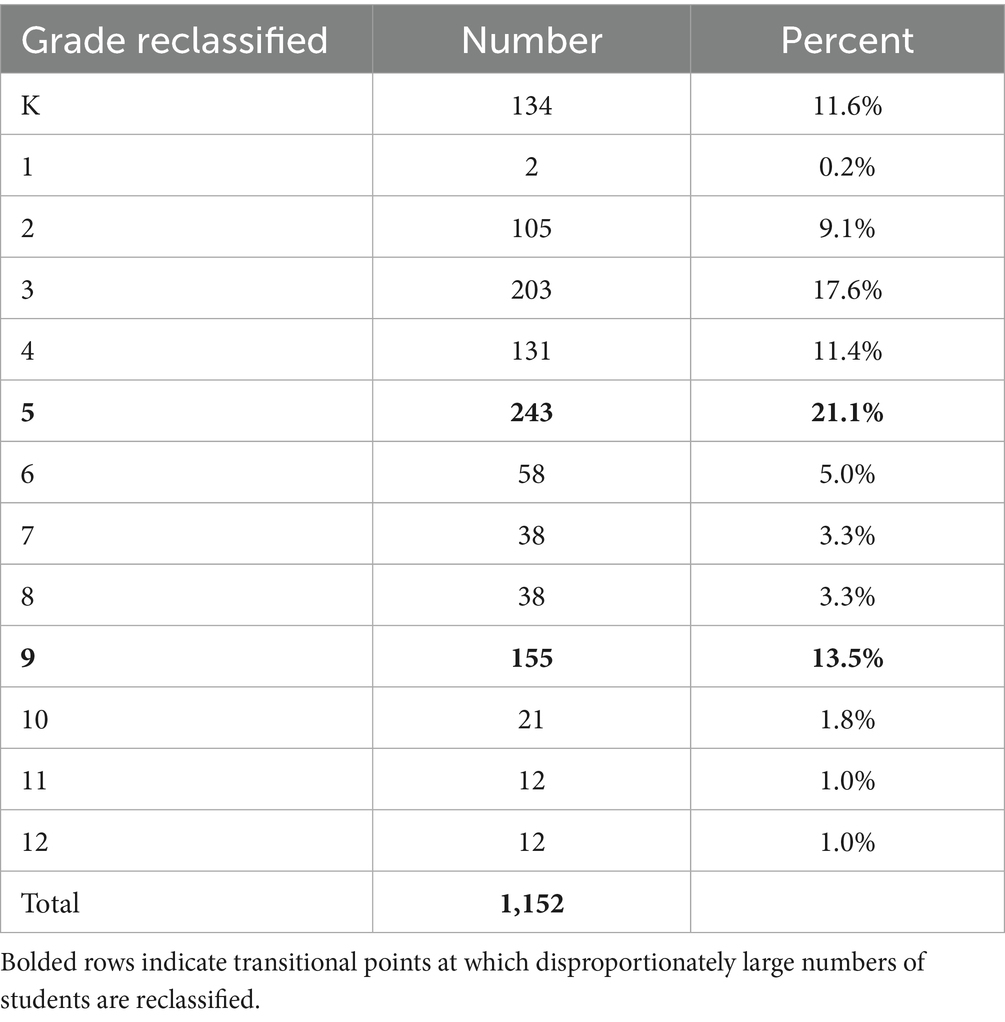 To address this question, we searched district records to identify the grade when students were classified as RFEP. We found wide variation, with some students being reclassified at the end of kindergarten and a few students not reclassified until 12th grade. Table 1 shows the distribution and percentage of students reclassified at each grade level.