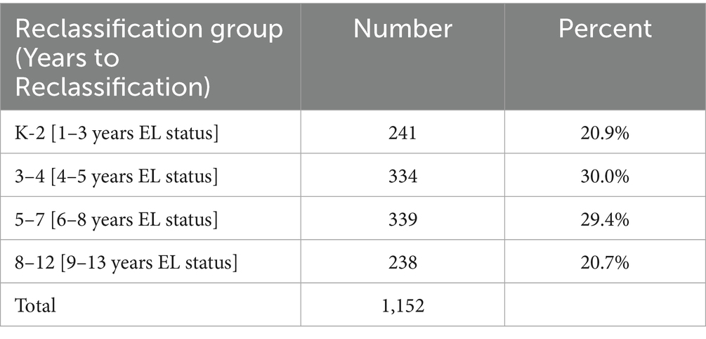 Several limitations need to be considered. First, the participants in our current study involved only two specific cohorts from school districts involved in a Research Practice Partner (RPP) in the San Francisco Bay area and findings may not generalize to other locales. Therefore, future research is encouraged to include a more diverse population of school districts with more diverse socioeconomic backgrounds. Second, the data collected for analyses consist only of student data; however, many other factors could contribute to early reclassification. This was evident given that our model explained a relatively low amount of the variation in age of reclassification. Therefore, future studies should include other demographic and school characteristics, such as parental and teacher input, to triangulate instructional practices that take advantage of a students’ linguistic assets rather than deficits for the purpose of boosting academic self-competence and learning. Third, this study only assesses the academic impacts of early reclassification. It would be important for future studies to investigate other non-academic aspects, such as social–emotional learning and well-being, which some researchers have already begun to do (Lee and Soland, 2023).