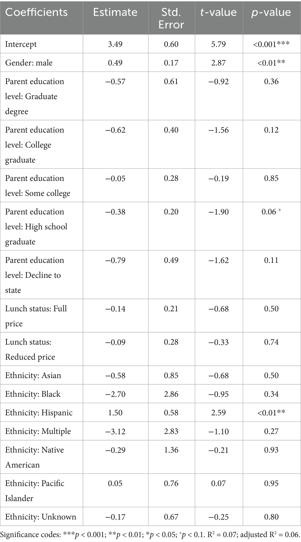 The regression analysis found that male students were reclassified significantly later than female students (p < 0.01) and that Hispanic students were reclassified significantly later than non-Hispanic students (p < 0.01). In addition, students with one or both parents who were high school graduates were reclassified earlier than students whose parents were not high school graduates, reaching marginal significance (p = 0.06). However, the relatively low R2 value (0.07; adjusted R2 = 0.06) suggests that there is still a large amount of variance left unexplained.