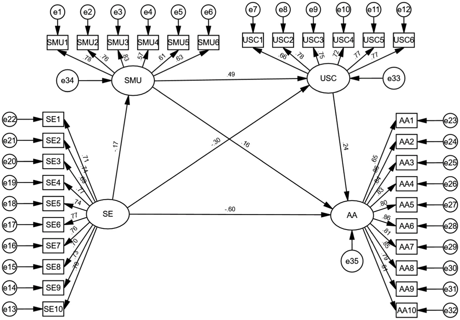 Standardized factor loadings and path coefficients in measurement model. SE, self-esteem; SMU, social media use; USC, upward social comparison; AA, appearance anxiety.