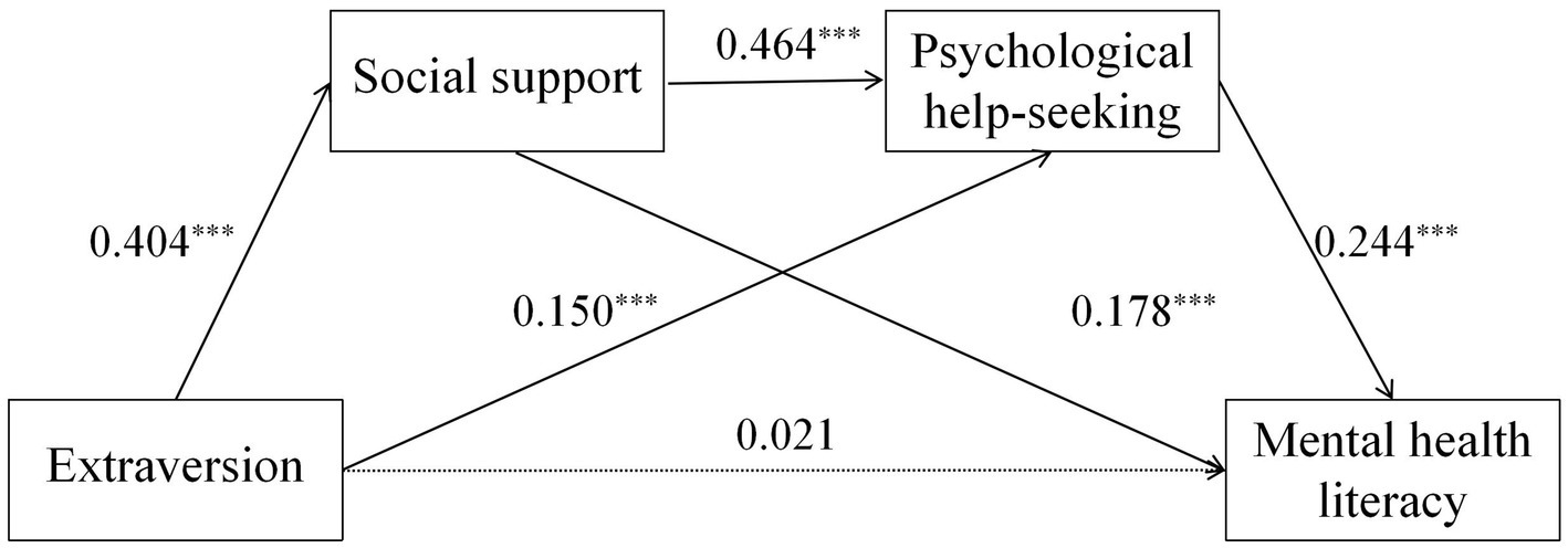 As outlined above, the strong social skills associated with extraversion enable individuals to obtain greater social support (Bao et al., 2018), which in turn provides more opportunities to access psychological and material resources from their social networks. Since social support positively predicts the intention to seek psychological help (Li and Wang, 2024), and willingness to seek help allows individuals to acquire mental health knowledge and skills through social relationships (Xie et al., 2021), this process ultimately contributes to the development of their MHL. While the relationships among these factors have been explored individually, their integration into a coherent mediating chain remains underinvestigated.
