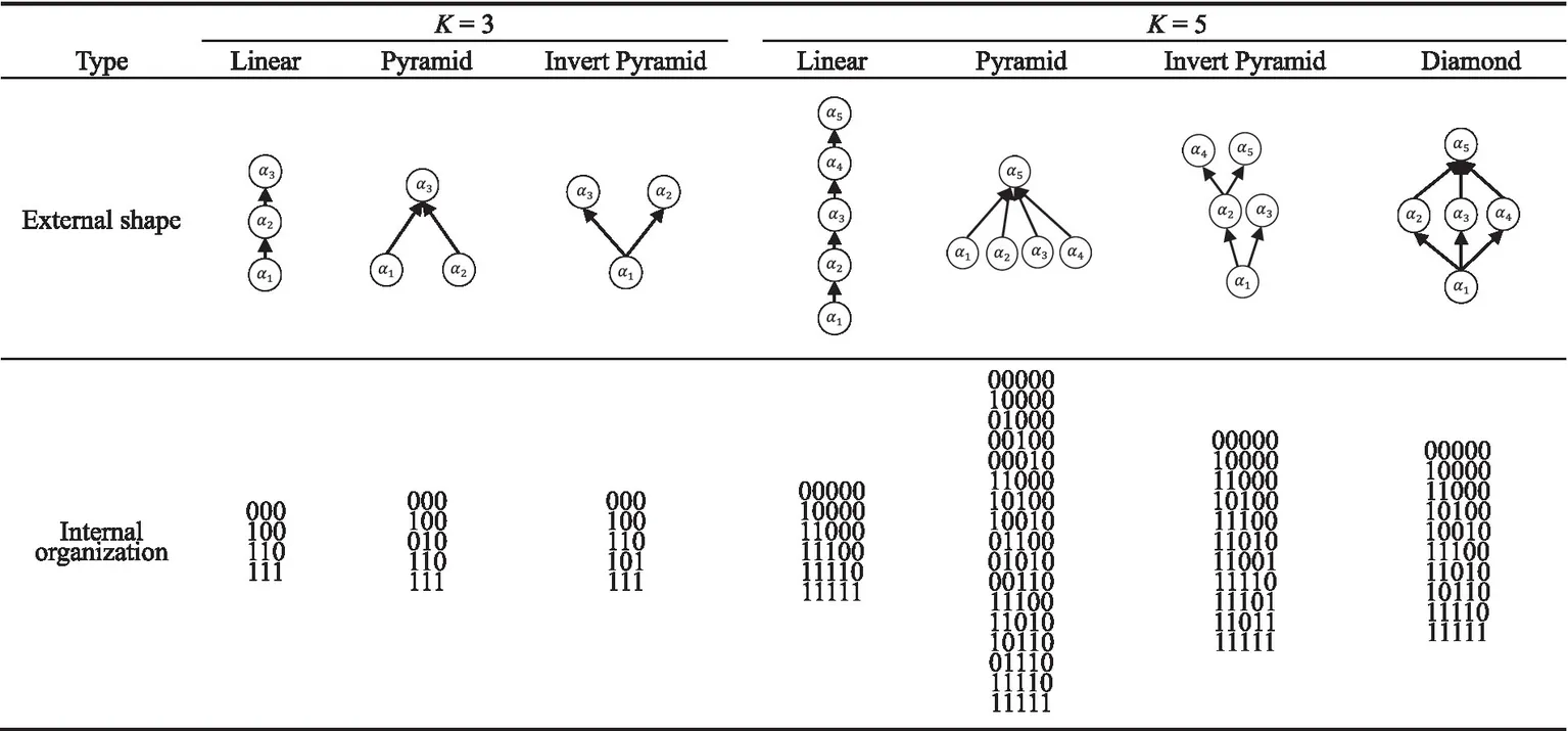 Several factors that may affect the performance of attribute hierarchy testing are manipulated here, including sample size (N), number of attributes (K), item quality (IQ), type of attribute hierarchy, attribute distribution, and attribute hierarchy validation method. In this case, the attribute hierarchy validation verification method is a within-subjects factor and the other factors are between-subjects factors. Specifically, three different sample sizes were considered: N = 200, N = 500, or N = 1,000 for small, medium, and large sample sizes, respectively. This setting has been widely used in previous CDM methodology studies (e.g., Ma et al., 2016; Sen and Cohen, 2021; Sun et al., 2024). The number of attributes was K = 3 and K = 5, which is a more common design in simulation or real data studies of CDM (e.g., Sen and Cohen, 2021; Templin and Bradshaw, 2014). According to Liu and Huggins-Manley (2016) and Liu (2018) on attribute hierarch. When K = 3, there are three levels of types of attribute hierarchy structure: linear, pyramidal, and inverted pyramid (Liu, 2018). When K = 5, there are four types of attribute hierarchical structures: linear, pyramidal, inverted pyramid and diamond. Some researchers (e.g., de la Torre, 2009; Leighton et al., 2004; Liu and Huggins-Manley, 2016; Liu, 2018), use directed acyclic graphs and binary vectors to visualize the external shape and internal organization of attribute hierarchies. In this context, the internal organization refers to the assumed permissible and impermissible attribute mastery patterns, which are represented by 0–1 vectors. The different types of attribute hierarchies are listed in Table 1. Three levels of item quality were considered here: high, medium, and low quality, respectively. This setting has been widely used in previous studies (e.g., Ma and de la Torre, 2016, 2019; Ma and Xu, 2021; Sorrel et al., 2017). Item quality was defined by the parameters and , respectively. For all items, represents the correct response probabilities of individuals who possesses none of the required attributes, and is fixed at , 0.2, or 0.3 for high, medium, and low item quality, respectively. represents the correct response probabilities of individuals who master all of the required attributes, and is fixed at , 0.8, or 0.7 for high, moderate, and low item quality, respectively. The attribute mastery patterns followed two distributions: uniform and non-uniform distribution. For the uniform distribution, all attribute mastery pattern is randomly generated from the permissible attribute mastery patterns with an equal probability. For non-uniform distributions, the design of Liu et al. (2022) was used here to obtain attribute mastery patterns. Specifically, the examinee’s attribute mastery pattern was generated from a dichotomized multivariate normal distribution whose mean vector was set to 0, and the off-diagonal elements of the covariance matrix were randomly drawn from the uniform distribution . In addition, three attribute hierarchy validation methods were used in this study, including the Wald test based on two covariance matrix estimators (Wald-XPD and Wald-Obs), and the LR statistic.