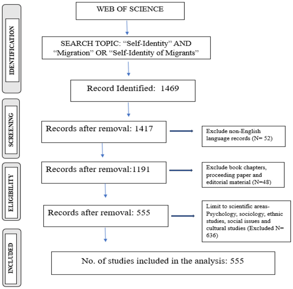 To conduct a comprehensive bibliometric review for this research, a systematic methodology was employed. According to Cobo et al. (2011), bibliometric analysis offers objective criteria, unlike traditional bibliographic reviews, which help in assessing research development and measuring the quality and productivity of knowledge production. This approach is particularly useful for evaluating research contributions from various entities, including countries, universities, research centers, journals, and individual researchers. In the present study, the search was conducted with specific inclusion and exclusion criteria: (1) a time frame spanning from 2004 to 2024 was utilized to capture relevant publications on self-identity and migration; (2) book chapters and editorial material were excluded, focusing instead on articles and reviews for their currency and relevance; (3) the search was limited to English-language publications, as English is the predominant language in scientific discourse and widely used in reviews (López-Fernández et al., 2016); and (4) the search was restricted to specific fields: social Sciences, Psychology (multidisciplinary), Sociology, Ethnic Studies, and Arts and Humanities, as categorized by the Web of Science. The initial search identified 1,469 records. After removing non-English language documents (N = 52), the total was reduced to 1,417 records. Further exclusion of book chapters and editorial material (N = 48) brought the count down to 1,191. Limiting the search to the specified scientific areas (Social Sciences, Psychology, Demography, Sociology, Ethnic Studies, Management, Cultural Studies) led to the exclusion of 636 records, resulting in a final dataset of 555 articles.