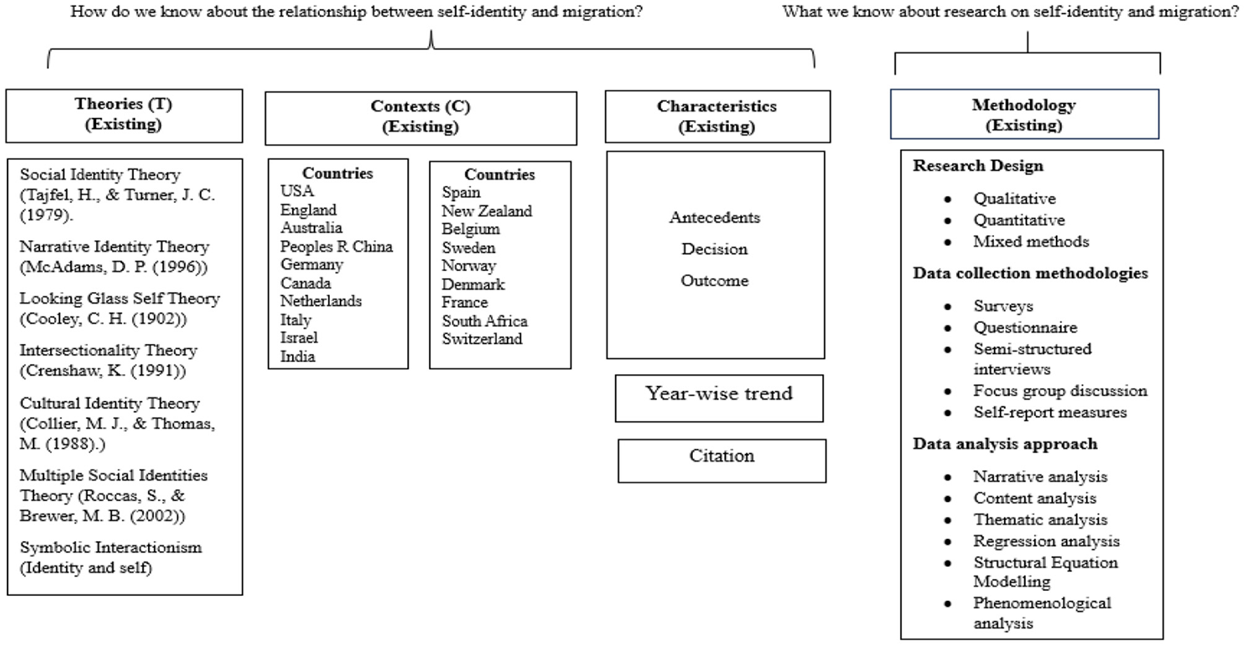 The first research question aims to systematically examine the historical progression of this body of literature using a bibliometric analysis. This approach will involve applying the TCCM framework to address the research questions and offer deeper insights into the theoretical foundations, contexts, characteristics, and methodologies used in studies related to the relationship between self-identity and migration.