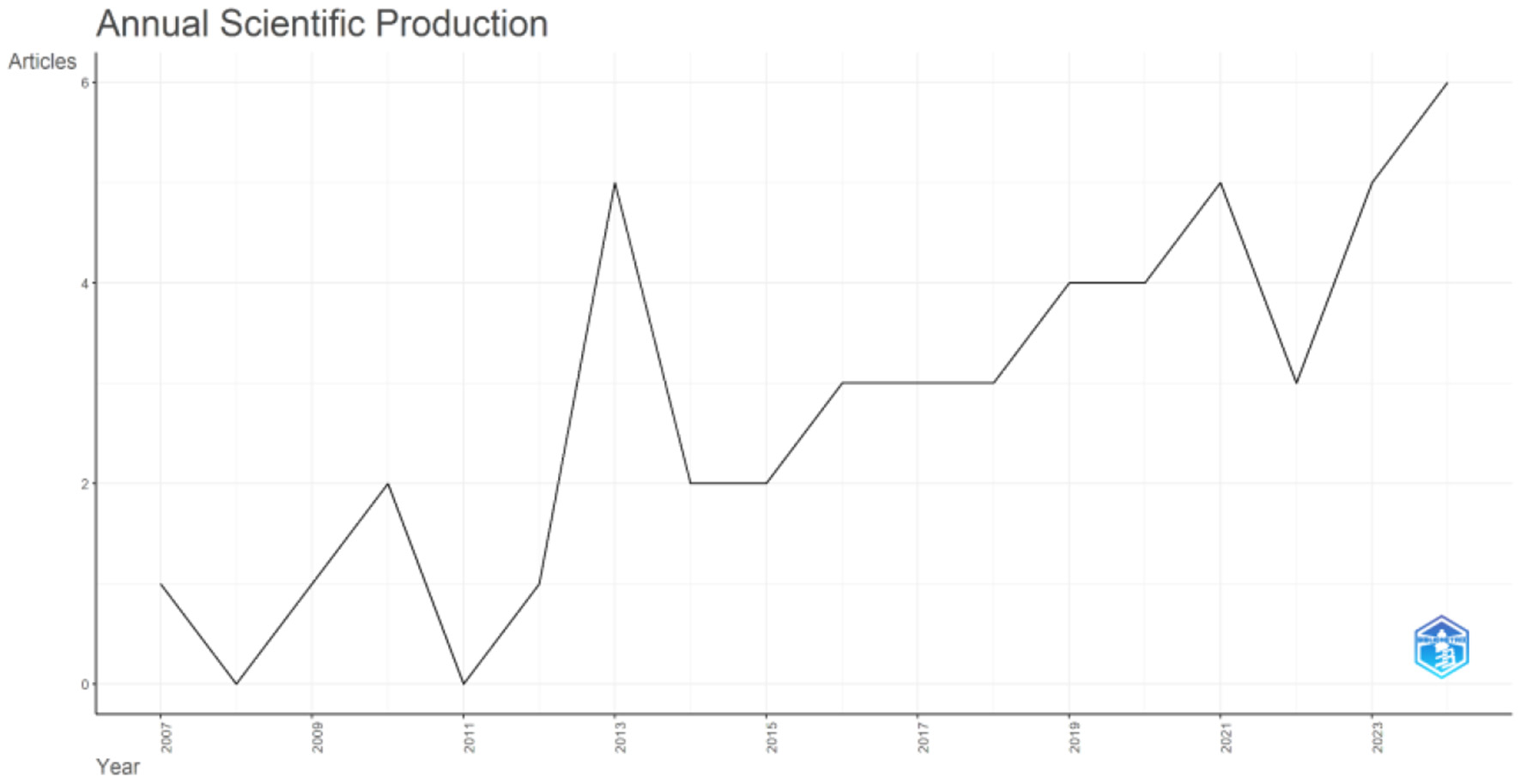 The annual scientific production from 2007 to 2023 shows fluctuating research activity, with a slow start from 2007 to 2012 as depicted in Figure 3. A notable increase began around 2013, followed by periodic dips in 2014 and 2020, both of which were followed by recoveries. Despite these downturns, there has been steady growth, with 2023 seeing the highest output of six articles. This upward trend reflects growing interest in the field, particularly regarding migration and self-identity, as interdisciplinary research in sociology, psychology, and cultural studies expands to explore the complexities of these topics.