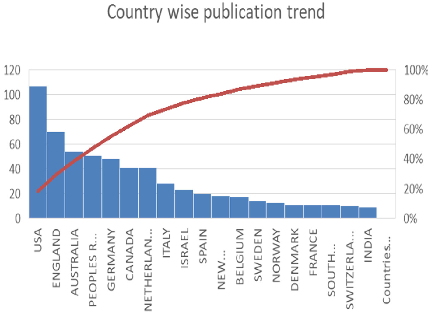 Figures 4, 5 shows a country-wise publication trend, with the United States (USA) leading in the number of publications, followed by countries like England, Australia, and Germany. The figure highlights that the majority of research is concentrated in Western countries, particularly the USA and European nations. Eastern countries, such as India and China, are present but have significantly fewer publications on topics like self-identity and migration. This suggests that there is a gap in research from the Eastern context, indicating a lack of studies addressing the interplay between self-identity and migration in regions with different cultural, social, and economic dynamics.