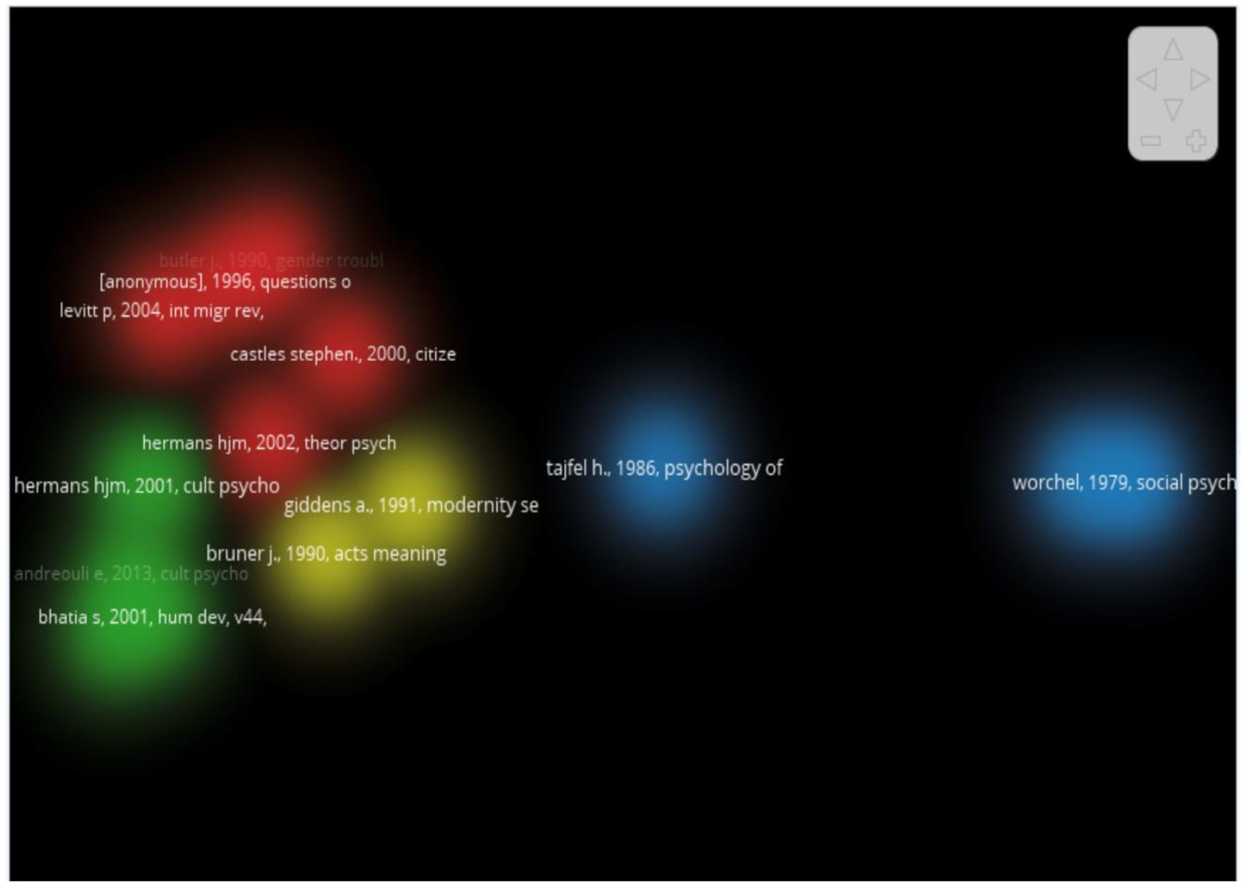 This method assesses a publication's impact by counting the number of times it is cited, with citation count serving as a direct and objective measure of its influence. By analyzing citations, we can identify the most influential works within a research field. The Vosviewer map reveals clusters of references, each distinguished by color, signifying closely related groups of works that form the intellectual structure of the field as illustrated in Figure 6. The present study utilized the methodology proposed by Akbari (2021) to conduct a co-citation analysis of scholarly articles. The objective was to identify clusters of co-citations that pertain to the domains of self-identity and migration.