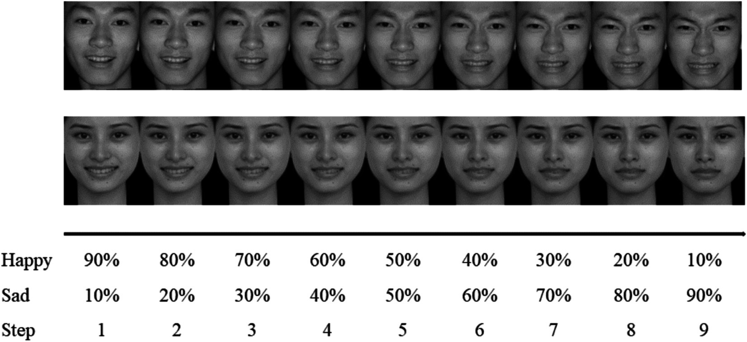 All images were standardized to a size of 260 × 300 pixels and processed using Photoshop to maintain consistent brightness and contrast. Fanta Morph software was used to generate 11 series by blending the happy and sad expressions of each face, with a 10% variation gradient. The 0 and 100% series, representing clear happy and sad expressions, were excluded. The remaining nine series of blurred emotional facial expressions were used as experimental materials for the blurred facial expression judgment task (see Figure 2).