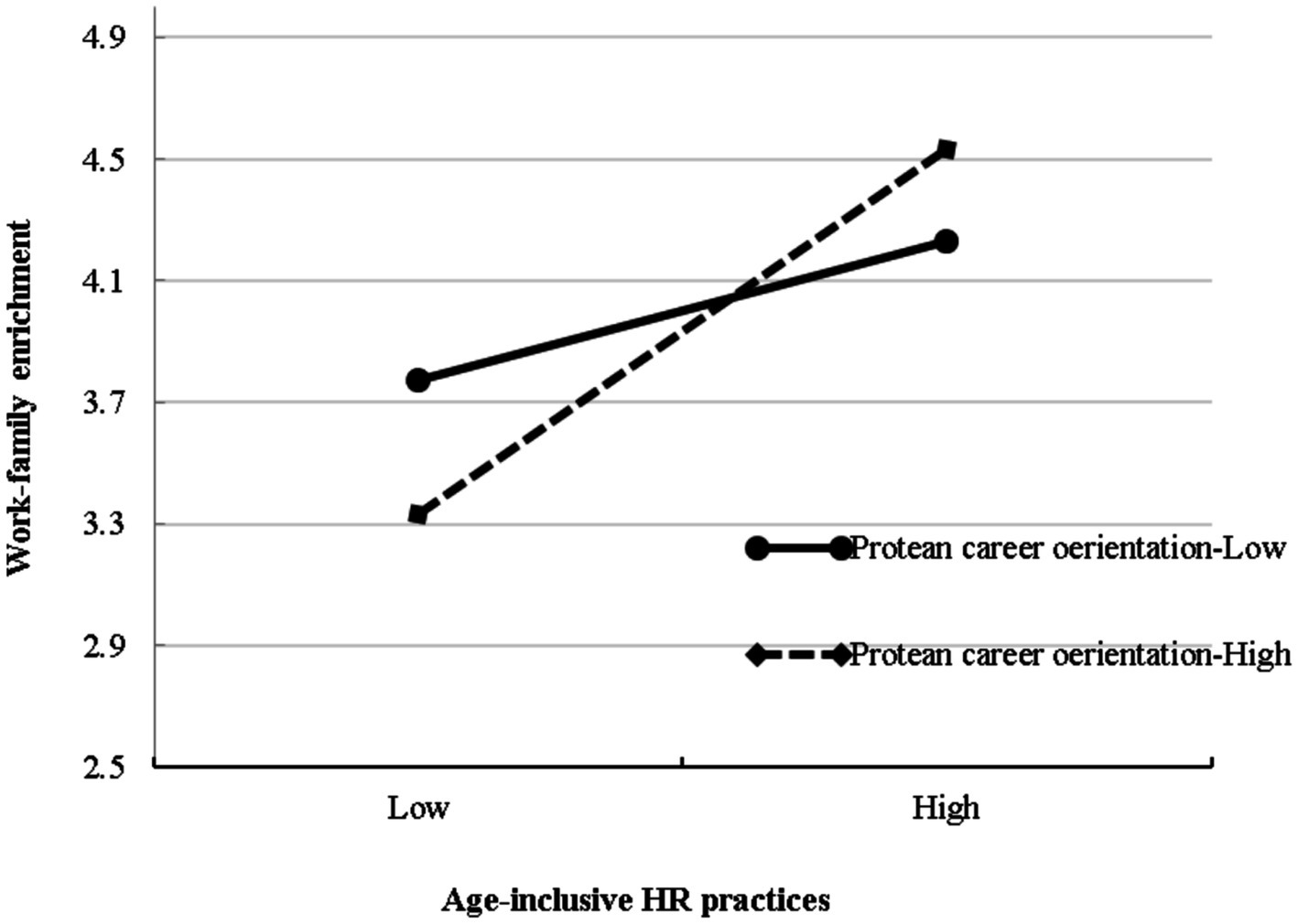 Furthermore, this study investigates the boundary conditions that explain how age-inclusive HR practices and employees’ work and non-work outcomes may vary. Drawing on WH-R model, a specific type of resource—protean career orientation, which is defined as a preference for employees to self-manage their careers (Briscoe and Hall, 2006)—is considered a salient boundary condition. Most conceptions of protean career orientation implicit the whole life perspective, such as pursuing a balanced work life (Hall and Richter, 1990; Direnzo et al., 2015) and serving the whole person, family, and life purpose (Hall, 2004). Thus, we argue that protean career orientation is a meaningful key resource that may amplify the effect of age-inclusive HR practices on work-family enrichment, fostering the transfer of resources from the work domain to employees’ personal lives.