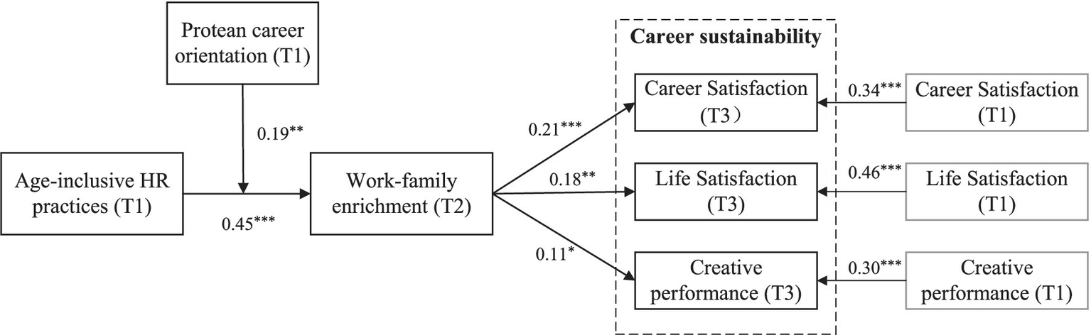 Drawing on conservation of resource theory and work-home resources model, this study explores how age-inclusive human resource (HR) practices related to employees’ career sustainability through their work-family enrichment. In line with work-home resource model, we introduce a boundary condition, protean career orientation, to explain when our proposed associated may unfold. We collected data in three waves from 244 employees to test our hypotheses. Results show that age-inclusive HR practices promote employees’ career sustainability through the mediating effect of work-family enrichment. Our findings also emphasize that protean career orientation strengthens the relationship between age-inclusive HR practices and work-family enrichment. Age-inclusive HR practices were more positively linked to career sustainability via work-family enrichment when employees had a high (versus low) protean career orientation. Our research provides a better understanding of how and when age-inclusive HR practices lead to sustainable career.