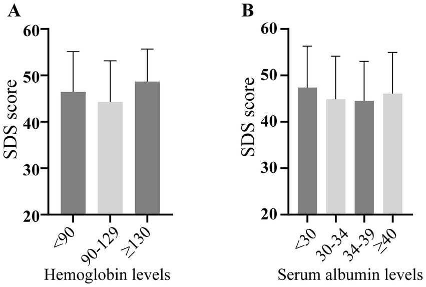 The Self-Rating Depression Scale (SDS), a widely used 20-item self-reported questionnaire, was utilized to assess depression. Upon obtaining informed consent, SDS questionnaires were distributed. Nurses, who were uniformly trained, explained the survey content and the instructions for completing the questionnaire, ensuring patients could complete it independently or with assistance. The SDS scores range from 25 to 100, with a score of 50 or above indicating clinical depression: 50–59 signifies mild depression, 60–69 moderate, and 70 or above severe (Zung, 1965; Dunstan and Scott, 2019).