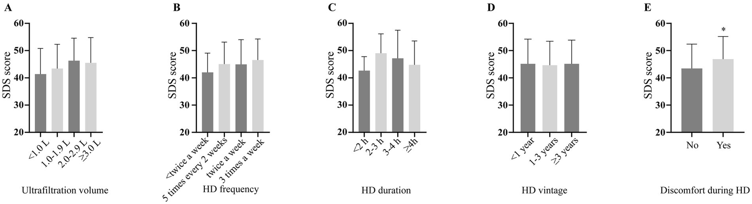 SDS scores were unaffected by laboratory results and dialysis parameters, with no variations observed for serum albumin, hemoglobin levels (Figures 2A,B), or dialysis specifics (volume, frequency, session duration, years on dialysis or discomfort during dialysis; Figures 3A–E).