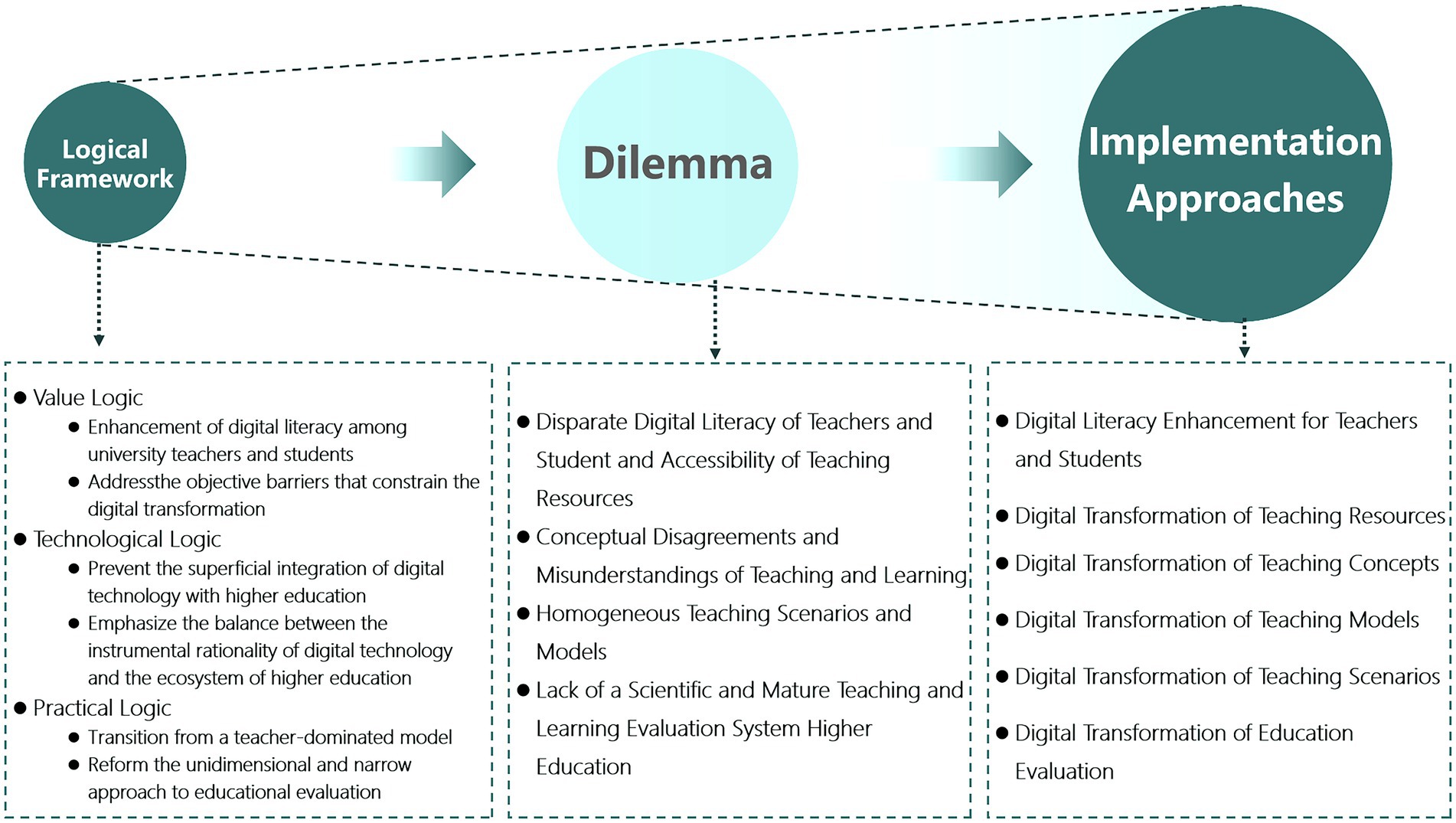 Thus, this paper has been structured accordingly. First, we present an overview of existing literature on digital transformation in higher education. This article initially preset that the three most critical logics associated with the digital transformation in higher education are value logic, technological logic, and practical logic, whereas the six most critical factors related to the transformation are teaching subjects, teaching concepts, teaching models, teaching resources, teaching scenarios, and evaluation system, which need to be verified as reasonable. In the following section, we outline our methodological approach that is followed by the presentation of our case study findings and analysis. Next, based on this analysis, we propose a logical framework for the digital transformation in higher education. We then analyze potential dilemmas in this process and also identify implementation approaches of digital transformation in higher education. Finally, we present the theoretical and empirical implications of our study, outline its limitations and make suggestions/perspectives for future research.