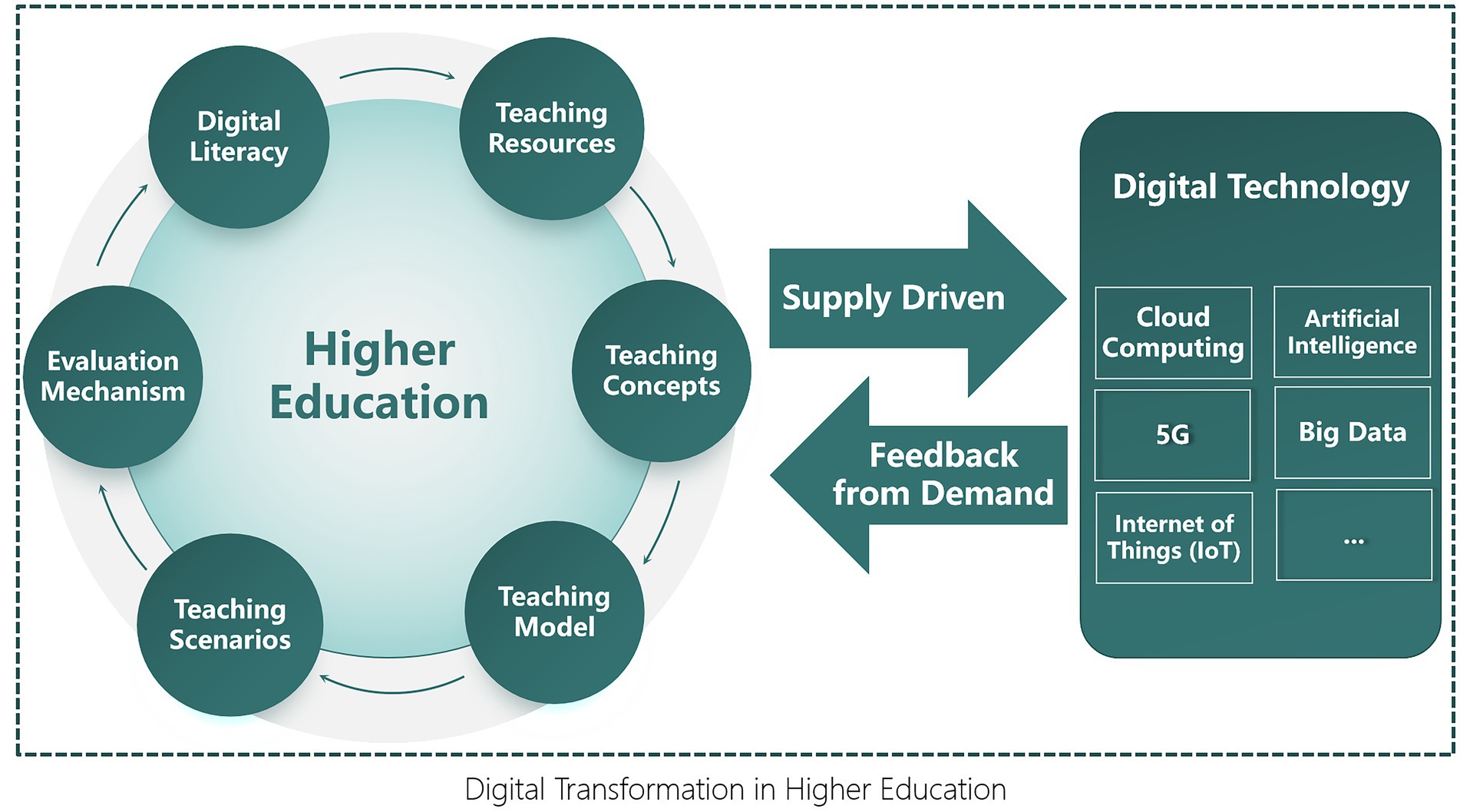 The digital transformation in higher education represents a holistic, systematic, and structural shift grounded in the practical realities of teaching and learning within higher education institutions. It does not entail a comprehensive deconstruction or outright rejection of traditional higher education but it rather emphasizes uncovering the latent interconnections among various elements in the process.