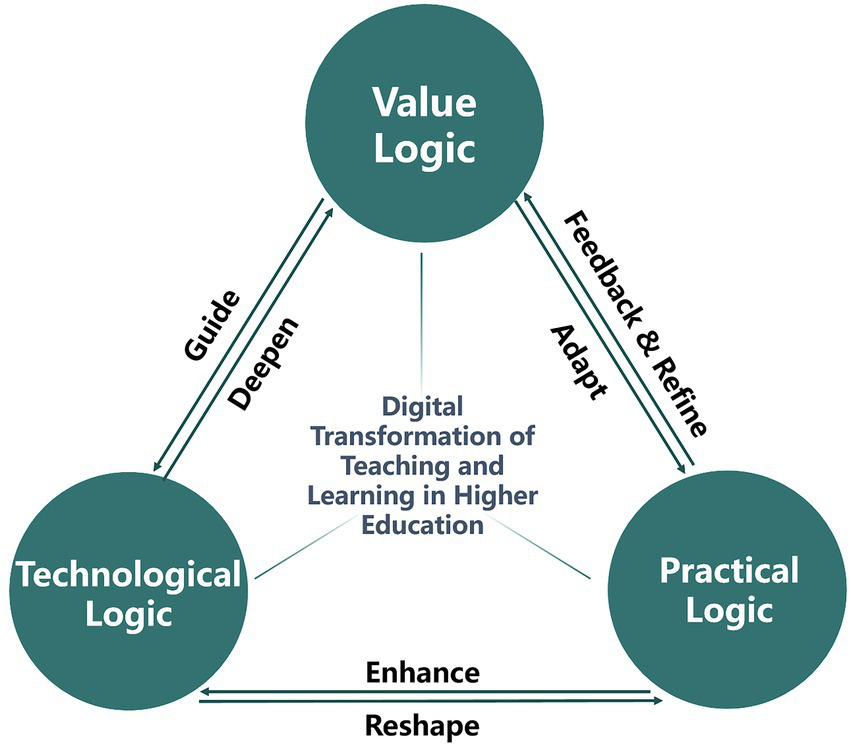 Thus, in this article a sustainable and integrated framework for the digital transformation in higher education is also proposed, comprising the value logic, technological logic, and practical logic. The triple logic framework overcomes these limitations by integrating value-driven, technology-oriented, and practice-based perspectives. Within this framework, value logic guides technological logic and is further refined during technological application. Technological logic strengthens practical logic and reshapes it through teaching practices, while practical logic evolves according to value logic and provides ongoing feedback to enhance and refine value logic based on experiential insights (see Figure 1). This framework seeks to transform the empowering effects of digital technology into new momentum for advancing the high-quality development of higher education.